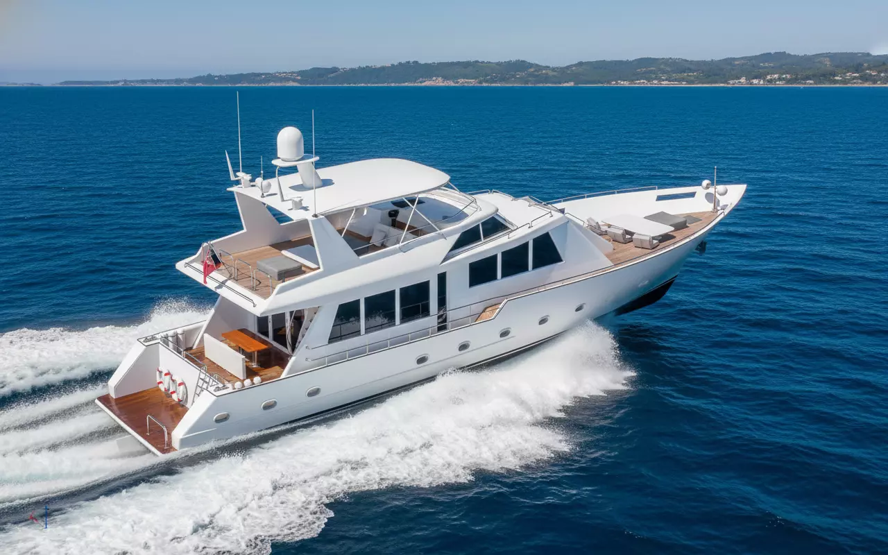 Large forward bow sunpad area with surrounding railings for safe loungingElevated flybridge with wrap-around white upholstered seating, central table, and radar domesMain deck aft cockpit with additional lounge seating, teak flooring, and easy access stairsPanoramic tinted windows on the enclosed salon area for bright, luxurious interiorsClean minimalist design with stainless steel accents, navigation equipment, and streamlined profile