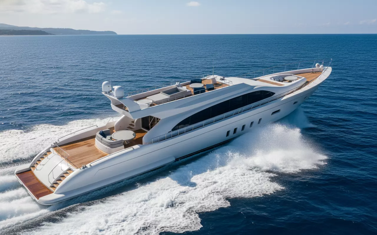 Fully open deck layout with large bow sun lounge, multiple seating groups, and round tablesSpacious aft cockpit and swim platform with teak flooring and easy water accessElevated upper deck with additional lounge seating and radar domeModern minimalist design with panoramic sliding roof, stainless steel railings, and clean linesLuxurious navy blue upholstered cushions and sun pads for comfort and style