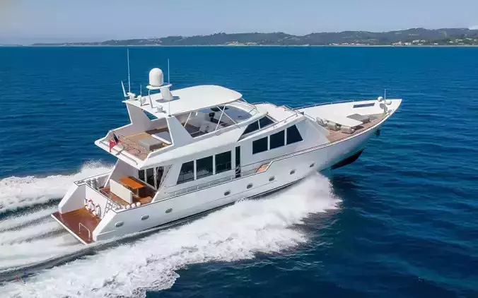 Full-displacement white hull with black accents and large panoramic windows for bright interiorsMultiple outdoor decks with luxurious teak flooring, lounge seating, dining table, and sun padsElevated flybridge with upper helm station, radar arch, domes, and additional seating areaAft cockpit with swim platform, life ring, stainless steel railings, and easy water accessRealistic details including antennas, navigation lights, portholes, and protected side walkways