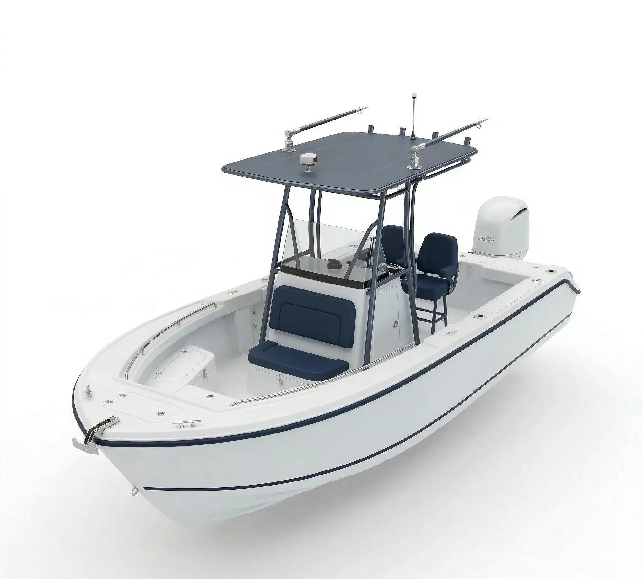 This high-fidelity 3D model depicts a contemporary center console fishing boat, meticulously designed for marine visualization and digital maritime environments. The vessel features a sleek white fiberglass hull with dark navy blue upholstery on the forward console seating and helm chairs. Key structural details include a robust T-top frame with a grey sunshade, integrated navigation lights, and a clear acrylic windshield protecting the helm station. Powered by a detailed white 300-horsepower outboard motor, the model showcases realistic deck fittings such as stainless steel grab rails, recessed storage lockers, and rod holders. This asset is an ideal choice for coastal architectural renders, nautical simulations, or as a high-quality vehicle prop for modern open-world games.