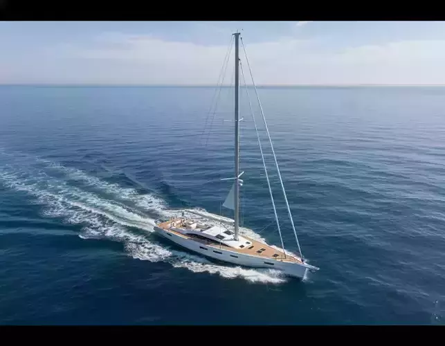 Classic fin keel monohull design with balanced proportions for performance and comfortTall aluminum-style mast with standing rigging and partially deployed sailsSpacious aft cockpit with dual helm stations, teak flooring, and seating areasModern deck layout including forward anchor locker, lifelines, and flush hatchesStreamlined cabin superstructure with large windows for a bright interior feel
