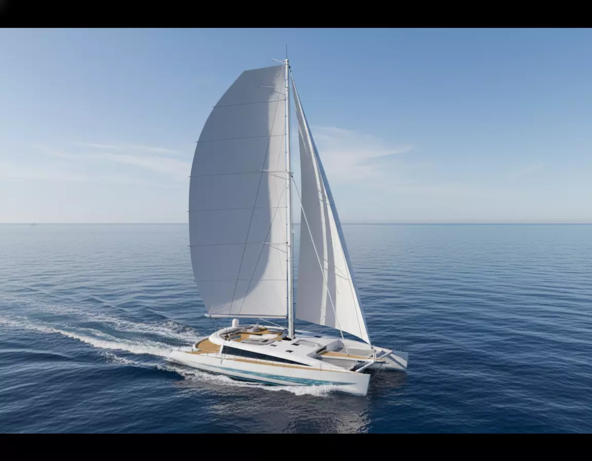 Wide twin hulls providing exceptional stability and spacious deck areaLarge modern square-top mainsail on a tall carbon-style mast with full standing and running riggingExpansive aft cockpit with helm station, seating areas, and realistic teak flooringForward trampoline netting and clean minimalist deck layoutStreamlined design optimized for both performance and comfort