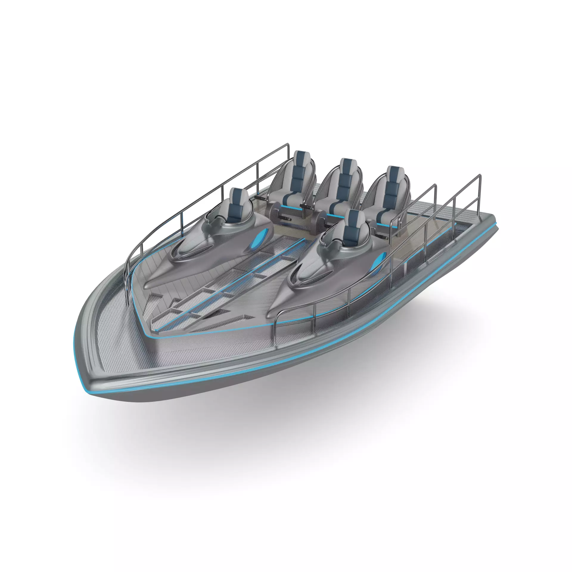 3 A multi-person pedal boat crafted in a futuristic and innovative design, with a metallic silver finish and neon blue LED lights, providing a unique and stylish experience for water recreation. (Current timeline)