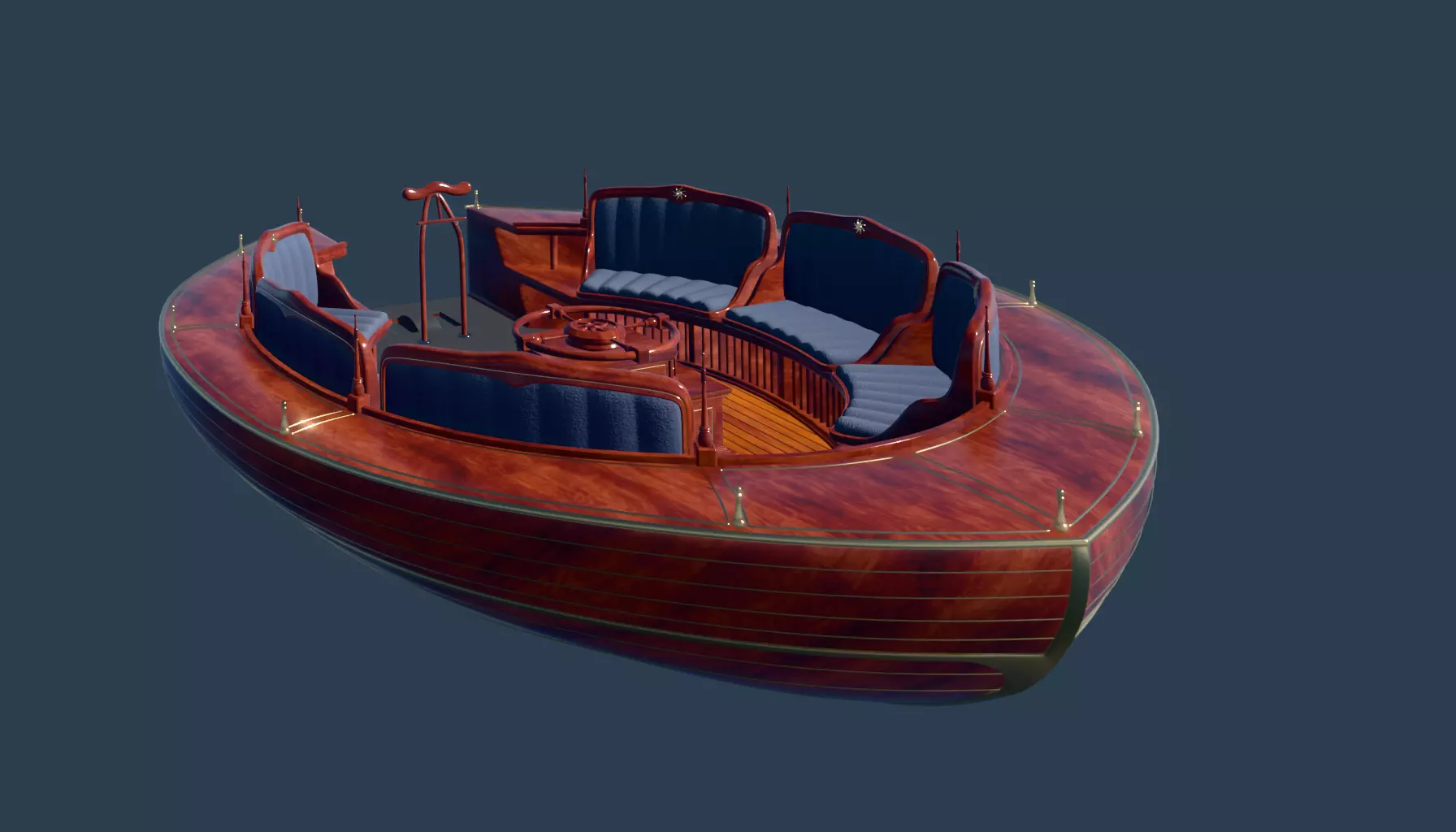 An antique multi-person pedal boat, crafted from polished mahogany wood with brass accents. The boat features a unique octagonal shape, painted in a deep navy blue color with gold trimmings. The seats are upholstered in plush velvet, adding a touch of sophistication to this historical watercraft.