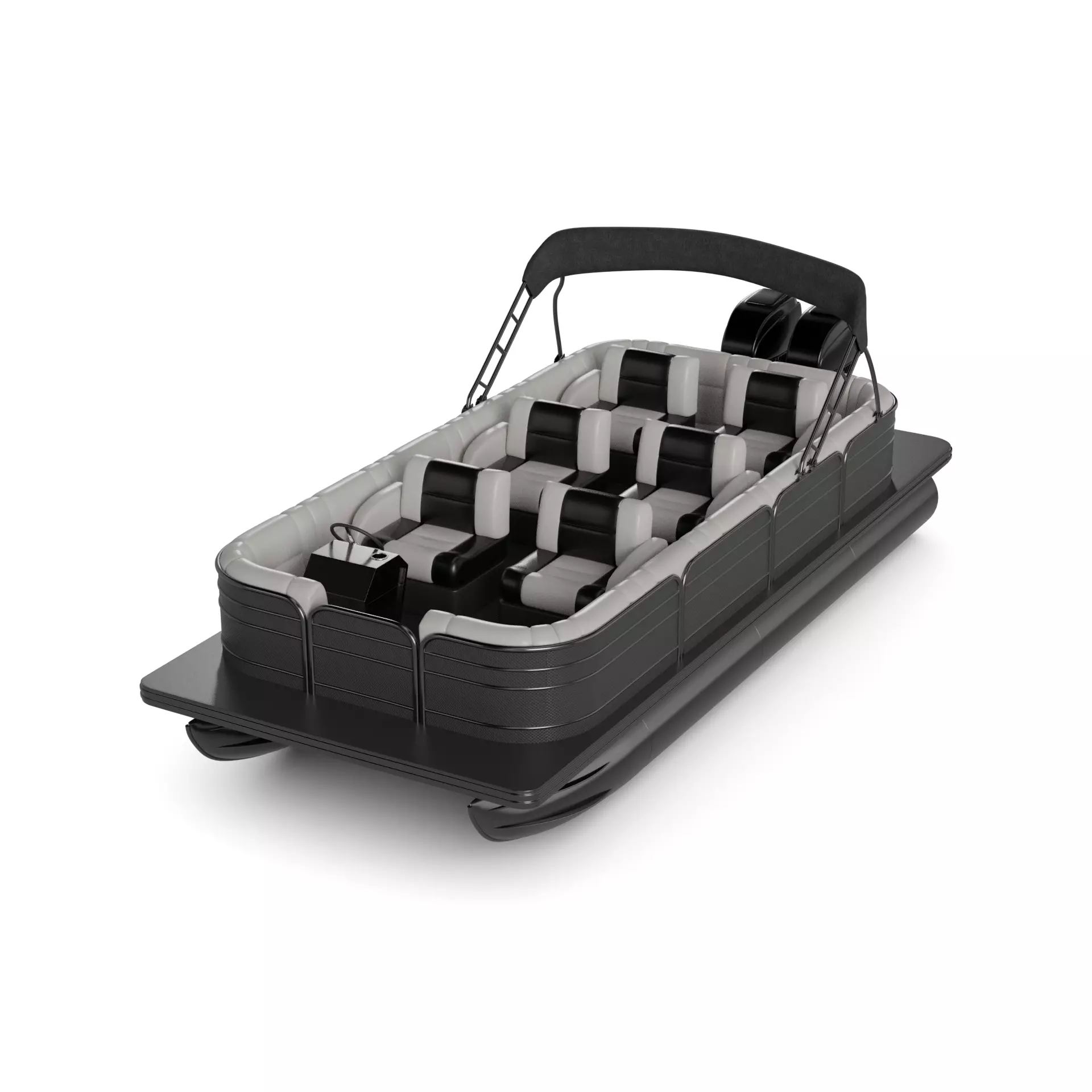This performance pontoon boat is perfect for thrill-seekers, with its bold black exterior, sporty design, and advanced technology for an exhilarating ride on the water in the present day.