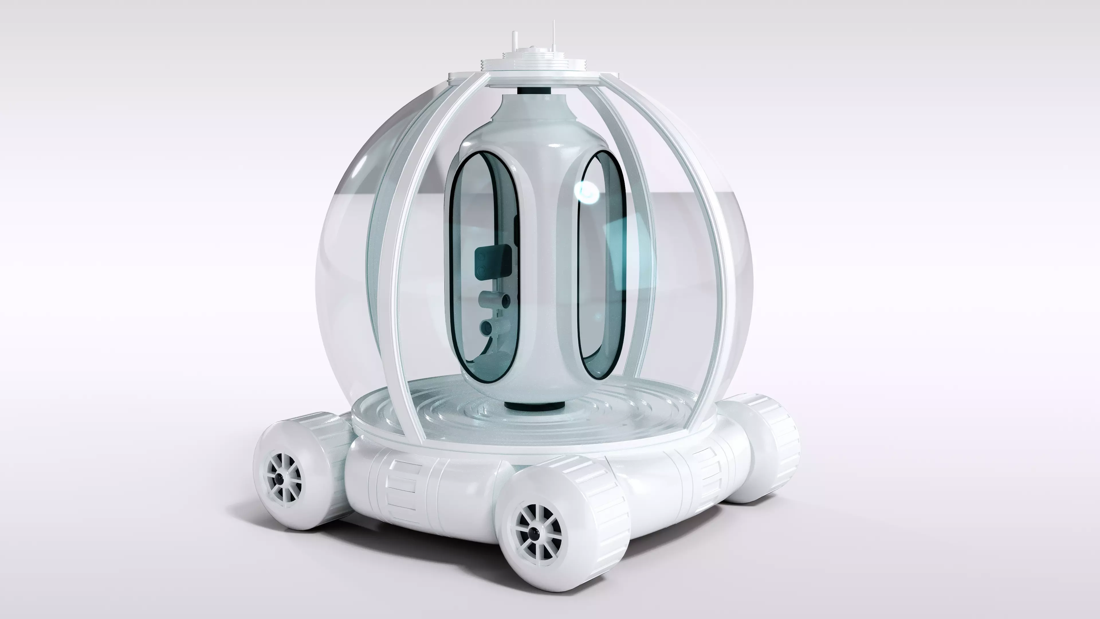 An innovative personal submersible featuring a transparent dome for 360-degree underwater views, with a silver metallic frame and a futuristic design tailored for research purposes in the current timeline.