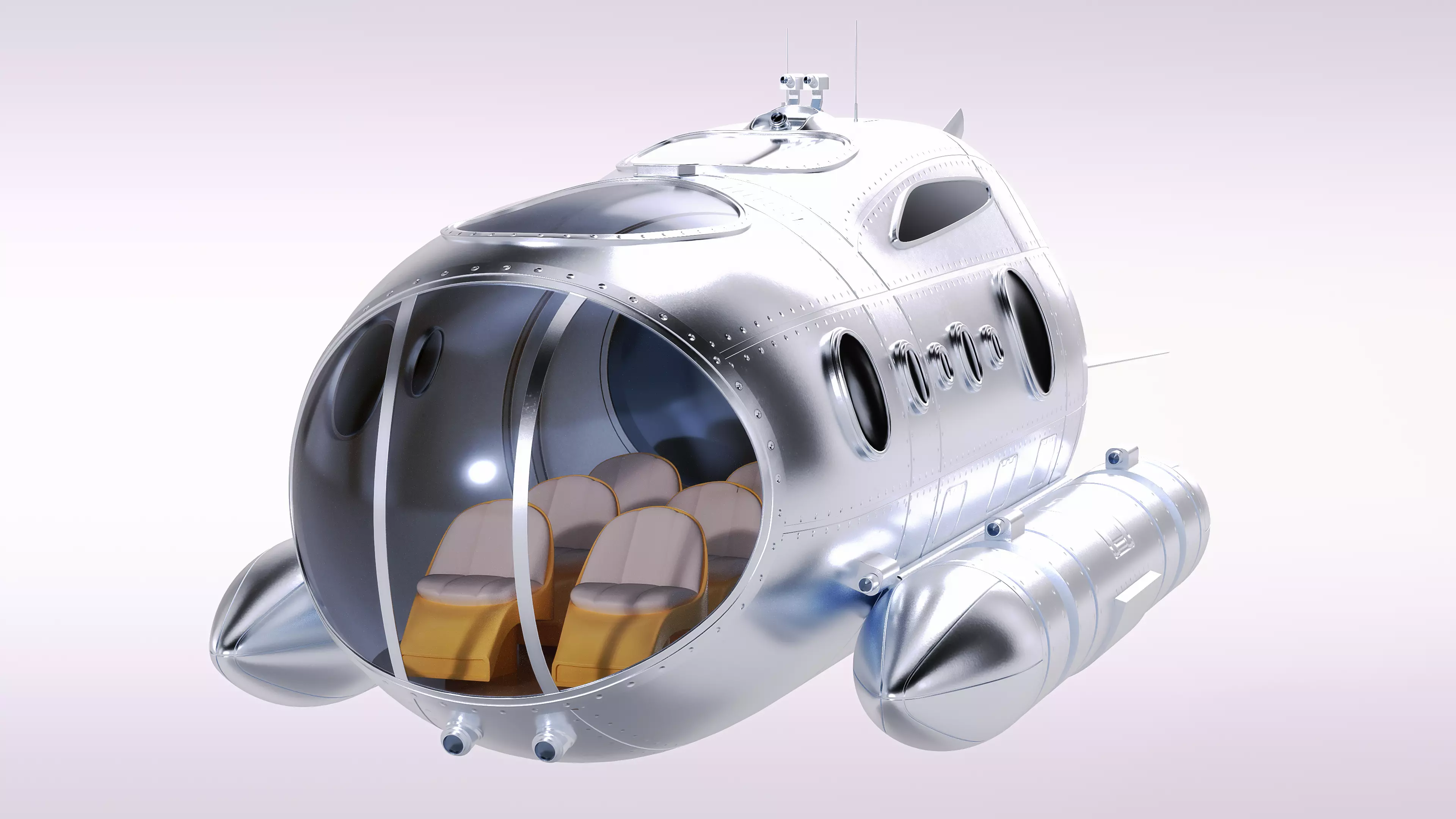 A modern personal submersible for civilians in the current era, boasting a striking metallic silver exterior with angular edges and a matte texture, complete with advanced navigation systems and comfortable seating for leisurely underwater exploration.
