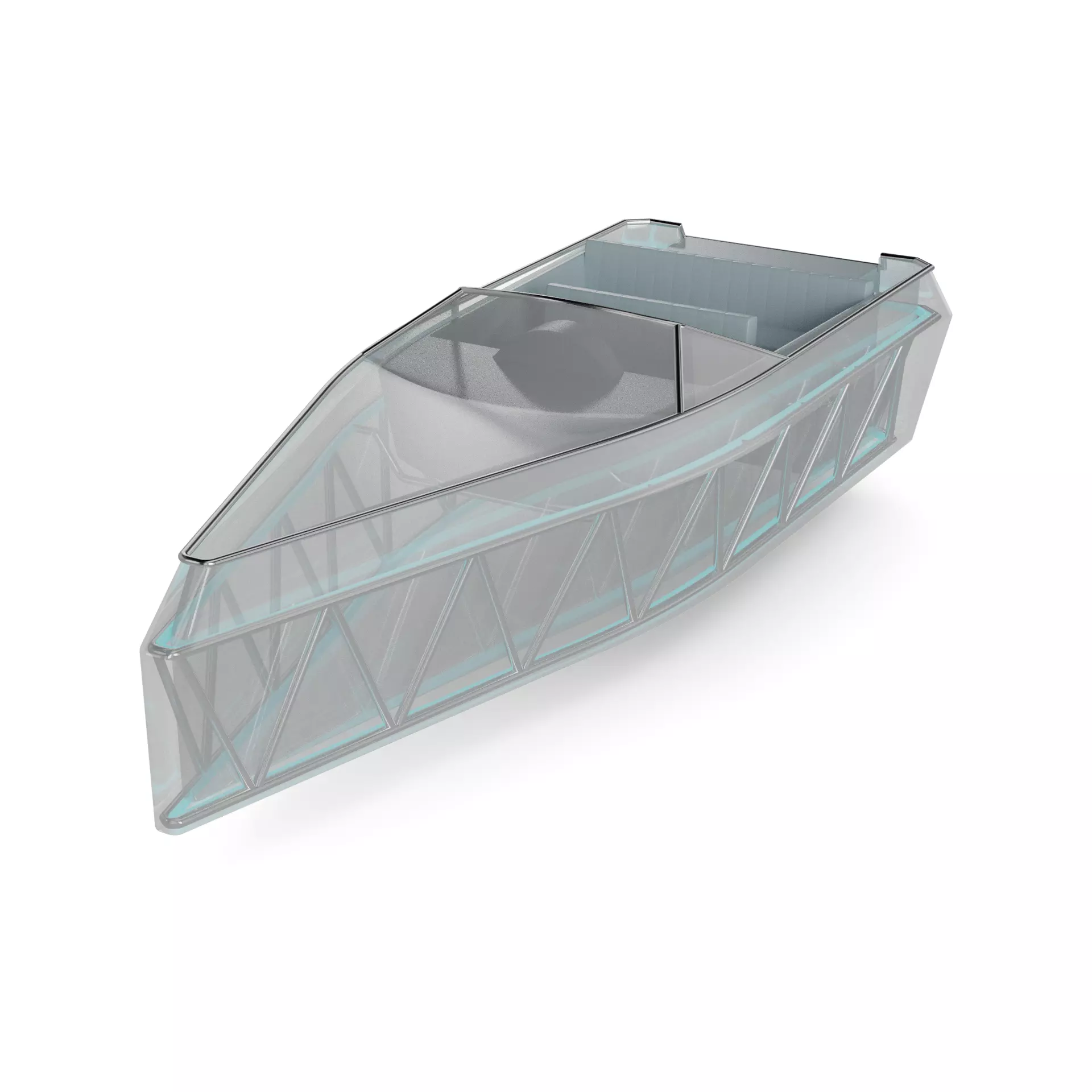 A sleek, futuristic rowboat made of transparent material, allowing a clear view of the water below, with neon blue lights running along the edges, giving it a high-tech appearance.