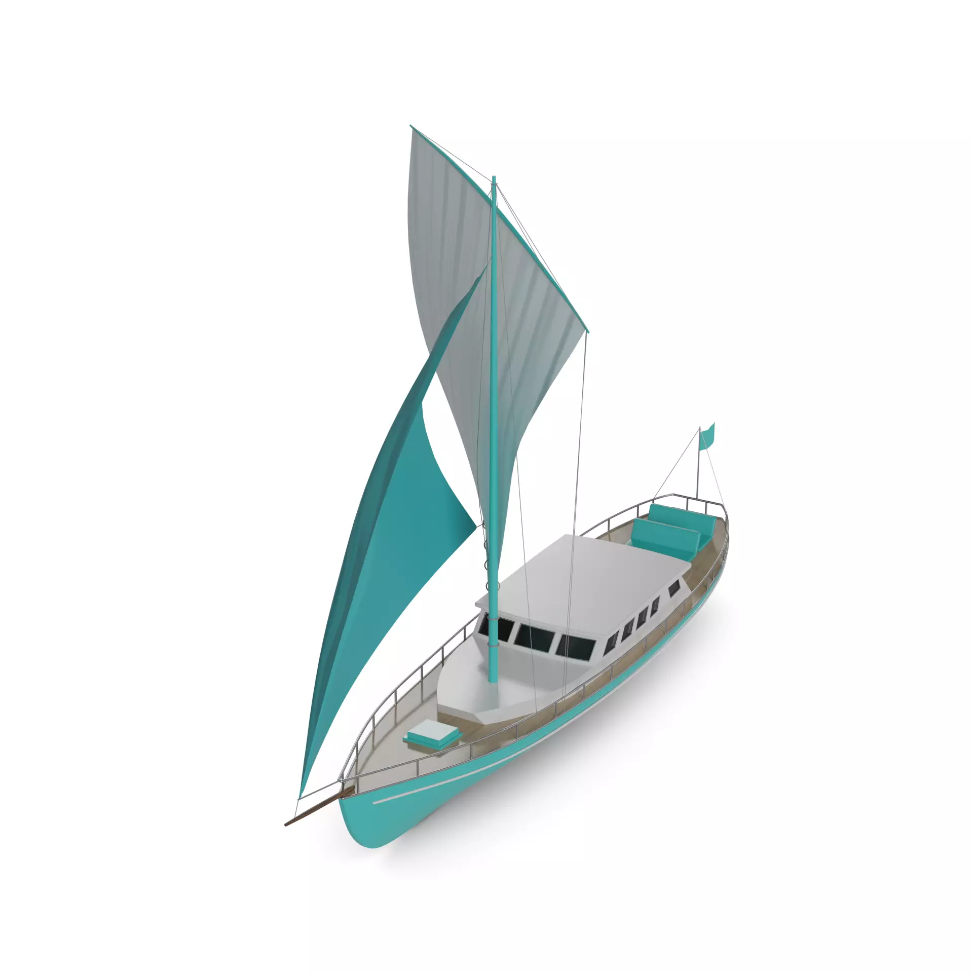 A sleek catboat with a single mast and a wide beam, perfect for leisurely sailing on calm waters. The boat is painted in a vibrant turquoise color, with white sails billowing in the wind against a clear blue sky. The deck is spacious, with comfortable seating for passengers to relax and enjoy the gentle rocking of the boat.
