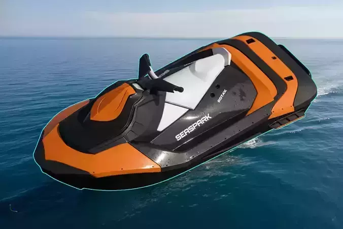 High-quality 3D model of a modern personal watercraft (jet ski) inspired by the Sea-Doo Spark series, featuring a bold orange and black color scheme with custom SeaShark and Rotax branding. This agile, high-performance PWC is ideal for dynamic water sports scenes, games, animations, visualizations, or any marine environment needing a sleek and realistic water vehicle.Key features:
