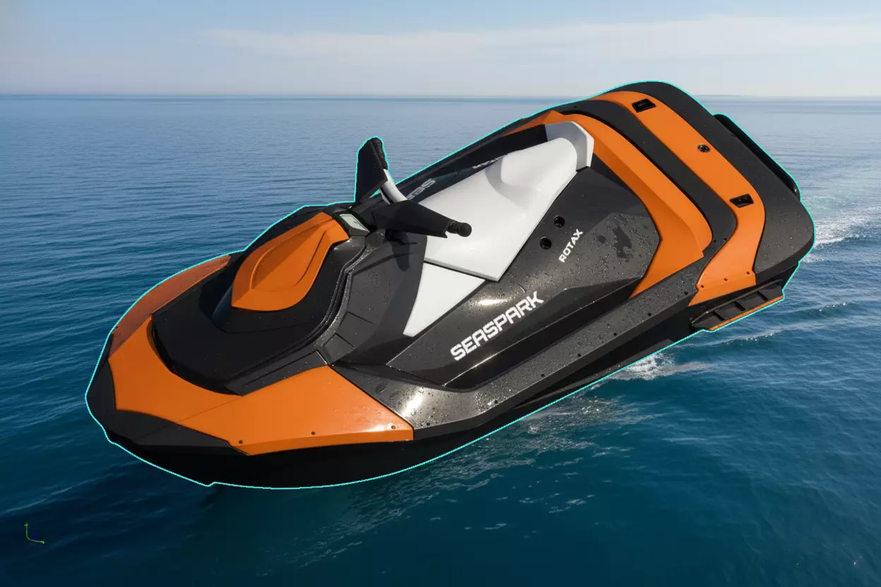 Sharp, aggressive hull design with glossy panels and dynamic accentsDetailed handlebars, controls, rearview mirrors, and textured seatingProminent custom decals including SeaShark and Rotax for added authenticityOptimized geometry with clean topology for real-time performance and close-up renders