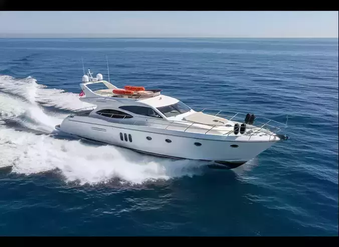 Dual-level design with enclosed main salon and elevated flybridgeUpper flybridge equipped with helm controls, seating, and protective hardtopRealistic details including black fenders, stainless steel railings, porthole windows, and antenna mastClean white hull with modern lines and subtle black accents for a sophisticated lookOpen aft deck and swim platform area for easy water access