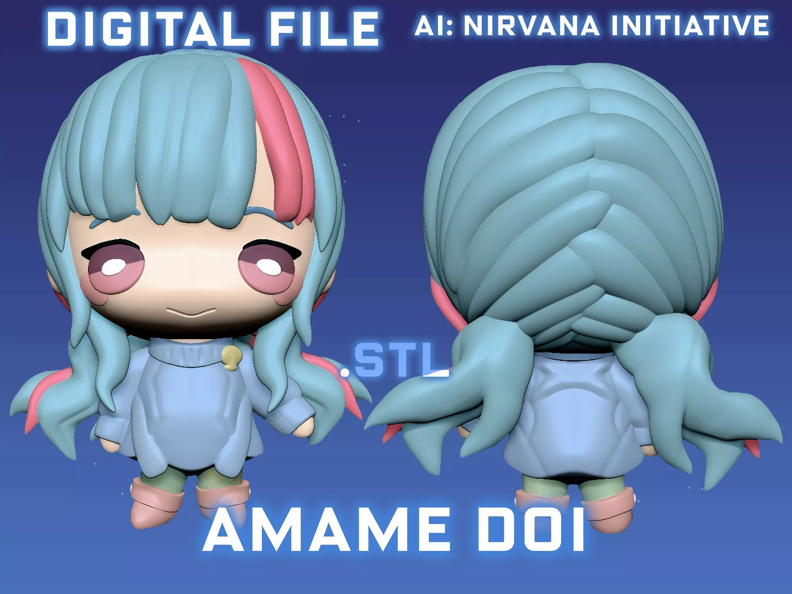 Figure of Amame from AINI, split into head and body files. The head piece fits into the body piece at the neck. It is recommended to print the head at an angle and the body upside down.