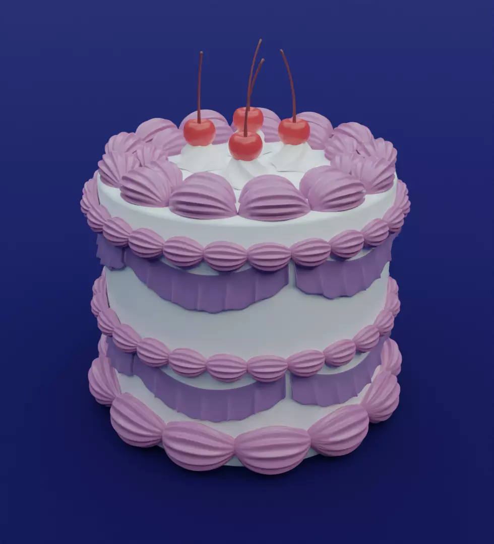 The content itself is a high polygonal 3D model of a cake with white and pink cream and blueberries, ready for 3D printing, which is intended for projects, animation, advertising, decoration and so on.