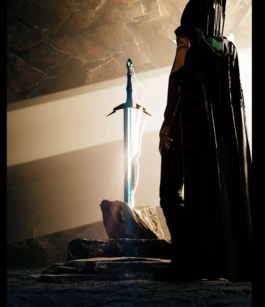 This highly detailed fantasy environment features a mysterious cave setting with a stylized female warrior character and an enchanted glowing sword embedded in stone. Ideal for use in game cinematics, promotional art, or 3D animation sequences.