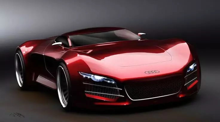 This is a stunning 3D render of a futuristic Audi concept car. The vehicle features a sleek, aerodynamic design with aggressive lines and a low, wide stance. The body is finished in a glossy metallic red, giving it a bold and luxurious appearance. Its front fascia showcases sharp LED headlights, a large hexagonal grille, and sporty air intakes. The car’s proportions emphasize performance, with wide tires, low ground clearance, and a sculpted hood. This design blends elegance and raw power, making it a perfect fit for high-end automotive showcases or futuristic racing simulations.