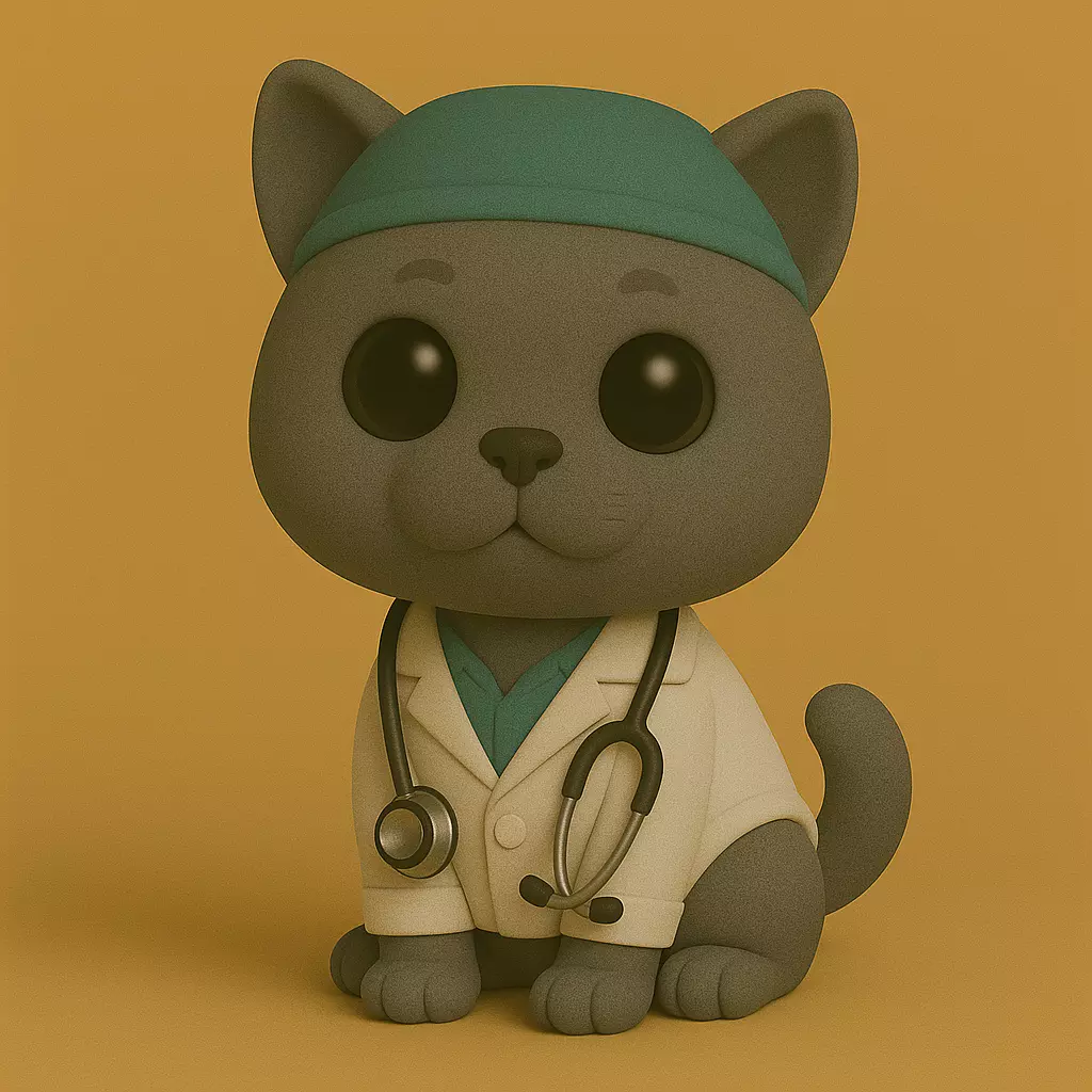 Colección Veterinario Pop STL — una serie exclusiva de figuras 3D en estilo chibi/Funko Pop, diseñadas con un toque tierno y profesional.Cada modelo representa a un animal vestido como veterinario, con su bata blanca, gorrito quirúrgico turquesa y estetoscopio, sobre un fondo cálido uniforme que resalta sus detalles suaves y expresivos.