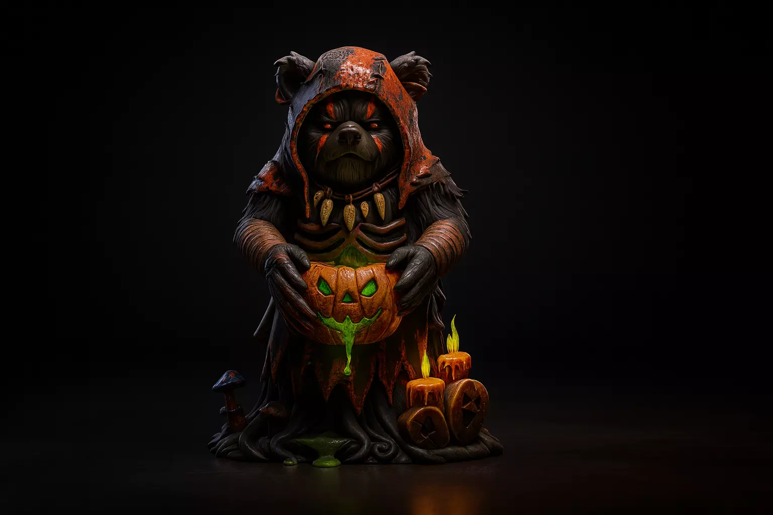 Bring a spooky and magical vibe to your Halloween decorations with this detailed Halloween Bear Shaman figurine. Designed with a haunting aesthetic, this mystical bear wears a bone-adorned hooded cloak while holding a glowing pumpkin cauldron dripping with eerie green slime. Perfect as a unique centerpiece, tabletop ornament, or addition to your fantasy and Halloween-themed collection.