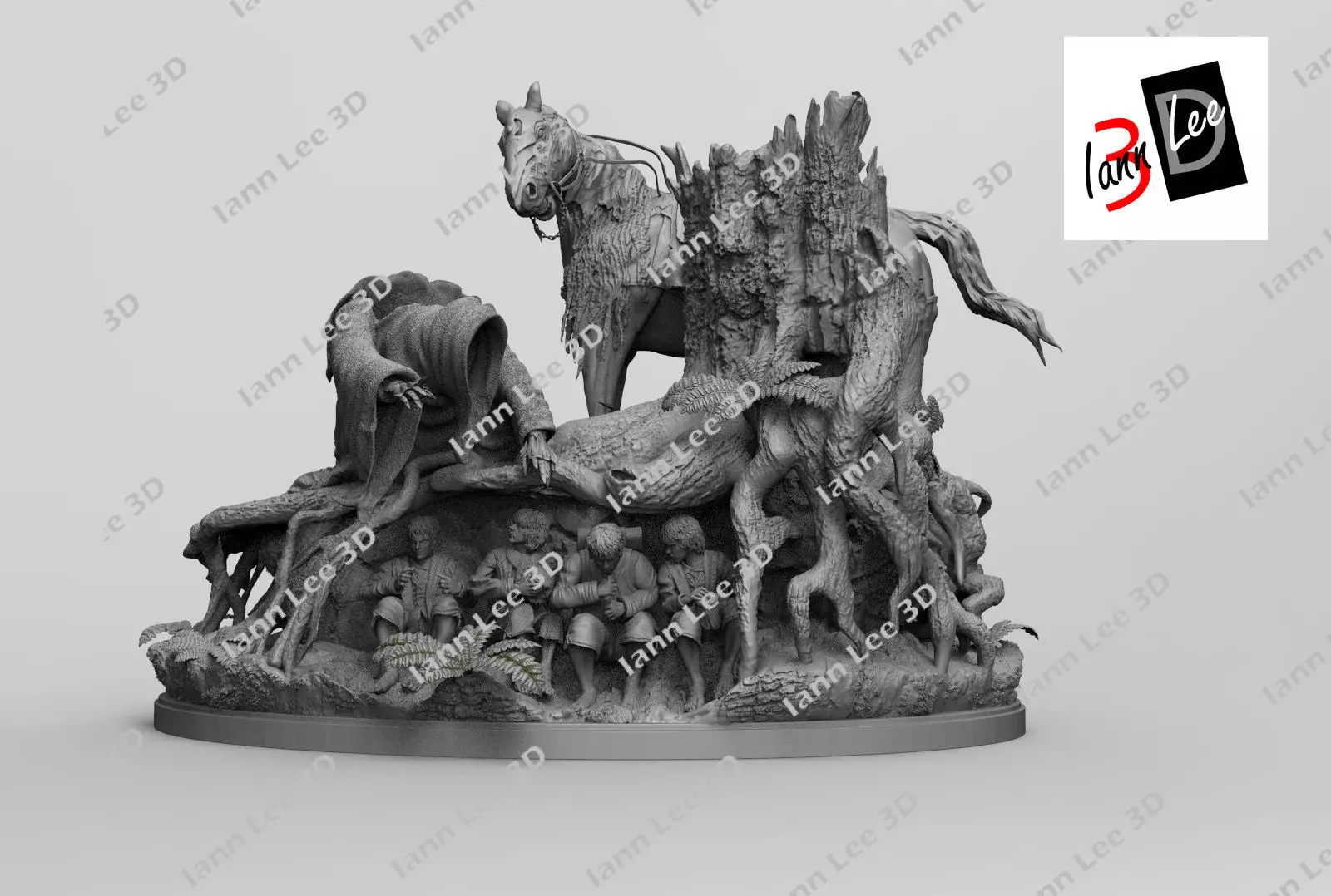 Revive uno de los momentos más icónicos y oscuros de El Señor de los Anillos: cuando los Nazgûl acechan a los hobbits y ellos, temblando de miedo, se esconden bajo un árbol en el bosque.Este modelo 3D captura con gran detalle la tensión y la atmósfera de esta mítica escena, ideal para coleccionistas y fanáticos de la saga.