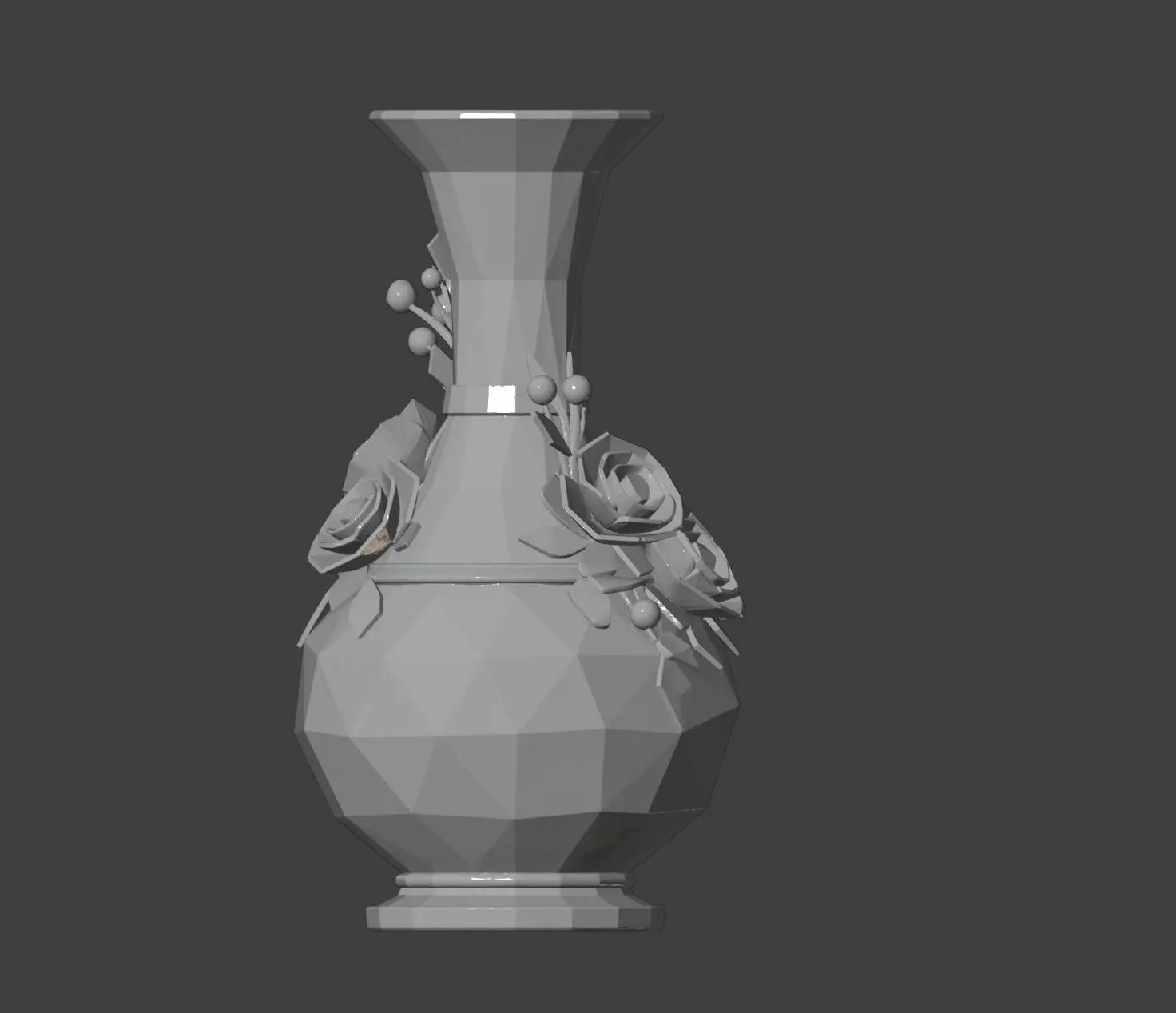This vase features a low poly art style design, with the vase body composed of multiple triangular facets, presenting a unique geometric aesthetic. The vase body uses soft gradient coloring, naturally transitioning from pink, blue to beige. The middle section of the vase is decorated with three-dimensional paper art style flowers and leaves, with roses in distinct layers, complemented by small buds and green leaf accents. The vase neck and base are decorated with gold trim, adding a luxurious touch. The overall design combines modern geometry with traditional floral elements.