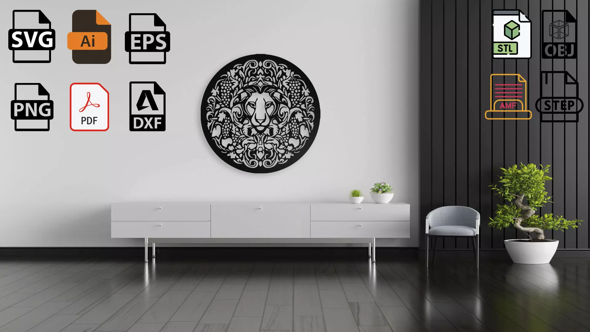 A stunning and highly detailed circular wall art featuring a majestic lion's head as the centerpiece. The lion is framed by an intricate, symmetrical wreath made of flowing grapevines, leaves, and clusters of grapes, creating a regal and naturalistic crest. This beautiful design is perfect for adding a touch of elegance and power to any room. Ideal for use as a focal point in home decor, a sophisticated emblem, or a unique piece of art. This file is perfect for 3d printing, laser engraving and cutting, wood carving, vinyl cutting, t-shirts, clothing, stickers, cardbox... You will receive these design in 10 file formats: STL, STEP, OBJ, AMF, SVG, DXF, AI, PDF, PNG, EPS