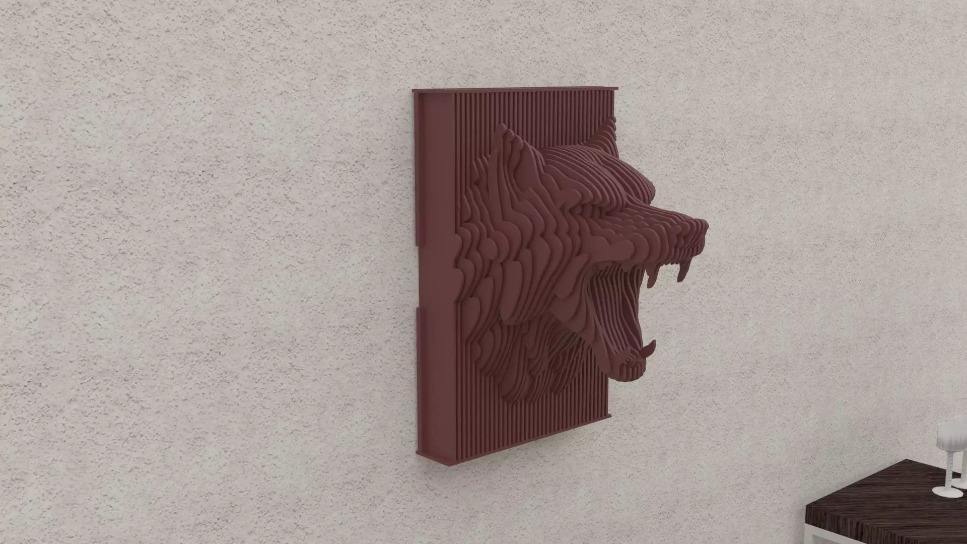 This is a captivating parametric wolf head sculpture designed with a modern aesthetic. The artwork consists of layered materials, carefully contoured to form the dynamic and detailed features of a wolf's head. The head is shown in an expressive pose, with its mouth open to reveal sharp teeth and a curved tongue, giving it a sense of energy and movement. The dark reddish-brown material and the vertical alignment of layers create a striking three-dimensional effect, emphasizing the intricacies of the wolf's design. This piece is not only a nod to artistic craftsmanship but also an example of innovative design using parametric techniques, blending art and mathematics beautifully.