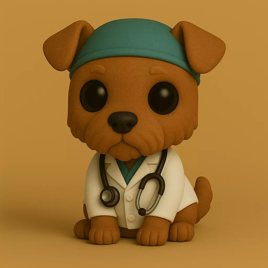Colección Veterinario Pop STL — una serie exclusiva de figuras 3D en estilo chibi/Funko Pop, diseñadas con un toque tierno y profesional.Cada modelo representa a un animal vestido como veterinario, con su bata blanca, gorrito quirúrgico turquesa y estetoscopio, sobre un fondo cálido uniforme que resalta sus detalles suaves y expresivos.