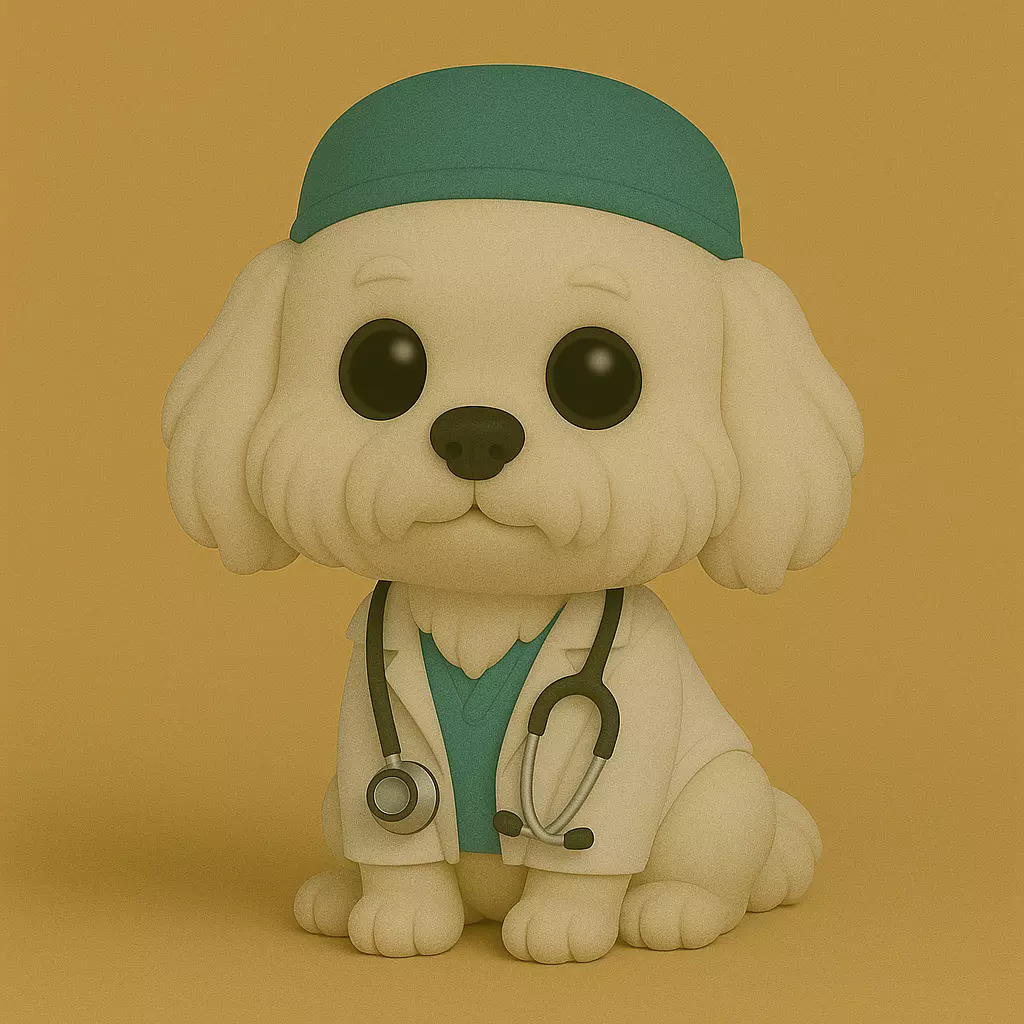 Colección Veterinario Pop STL — una serie exclusiva de figuras 3D en estilo chibi/Funko Pop, diseñadas con un toque tierno y profesional.Cada modelo representa a un animal vestido como veterinario, con su bata blanca, gorrito quirúrgico turquesa y estetoscopio, sobre un fondo cálido uniforme que resalta sus detalles suaves y expresivos.