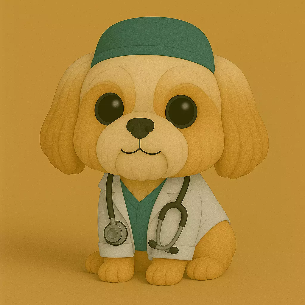Colección Veterinario Pop STL — una serie exclusiva de figuras 3D en estilo chibi/Funko Pop, diseñadas con un toque tierno y profesional.Cada modelo representa a un animal vestido como veterinario, con su bata blanca, gorrito quirúrgico turquesa y estetoscopio, sobre un fondo cálido uniforme que resalta sus detalles suaves y expresivos.