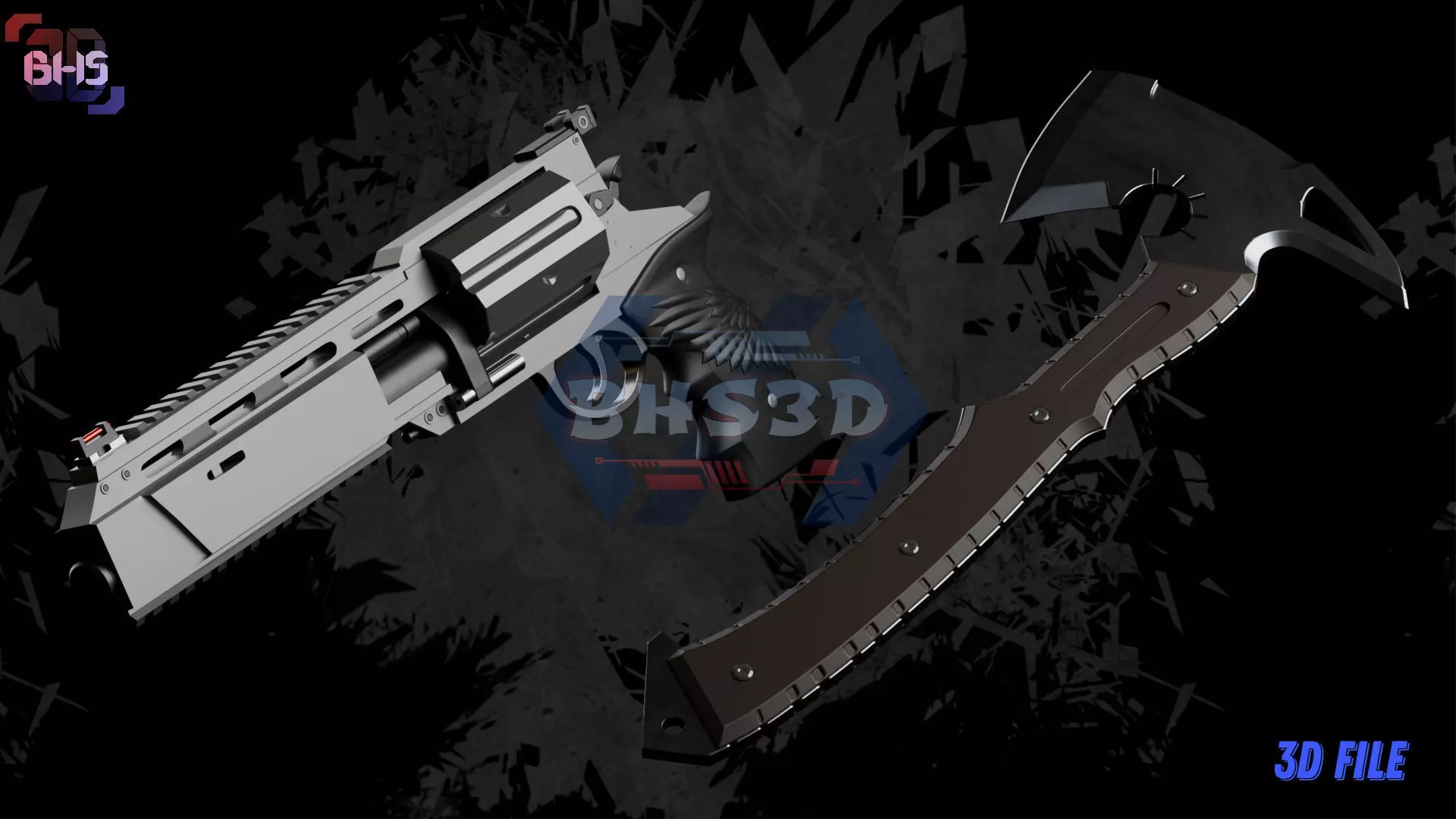 -just a file for printing-3D printable-For cosplay or wearable-i compressed file into rar/Zip,extract it and get link for download file-Separate part for easly in printing-The size is Length=41cm for revolver and heigth:48cm for hatchet,change the size and use your own size-2 Version for frame,with slice and no slice-The price includes the hatchet and revolver