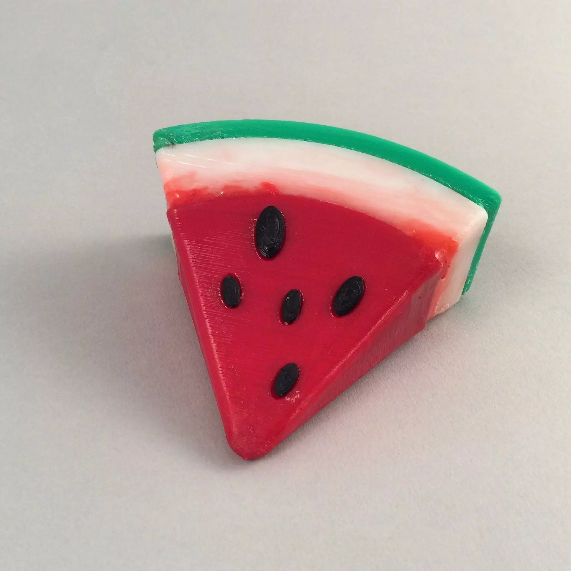 I made this for a friend who loves watermelons, and I hope it can be shared with other like minded fans. A small container in the form of a segment of water melon. Broken down into 4 colour prints, to be constructed with a glue. I have changed the design to include a wall cavity in the lid to reduce material and increase volume of space inside.