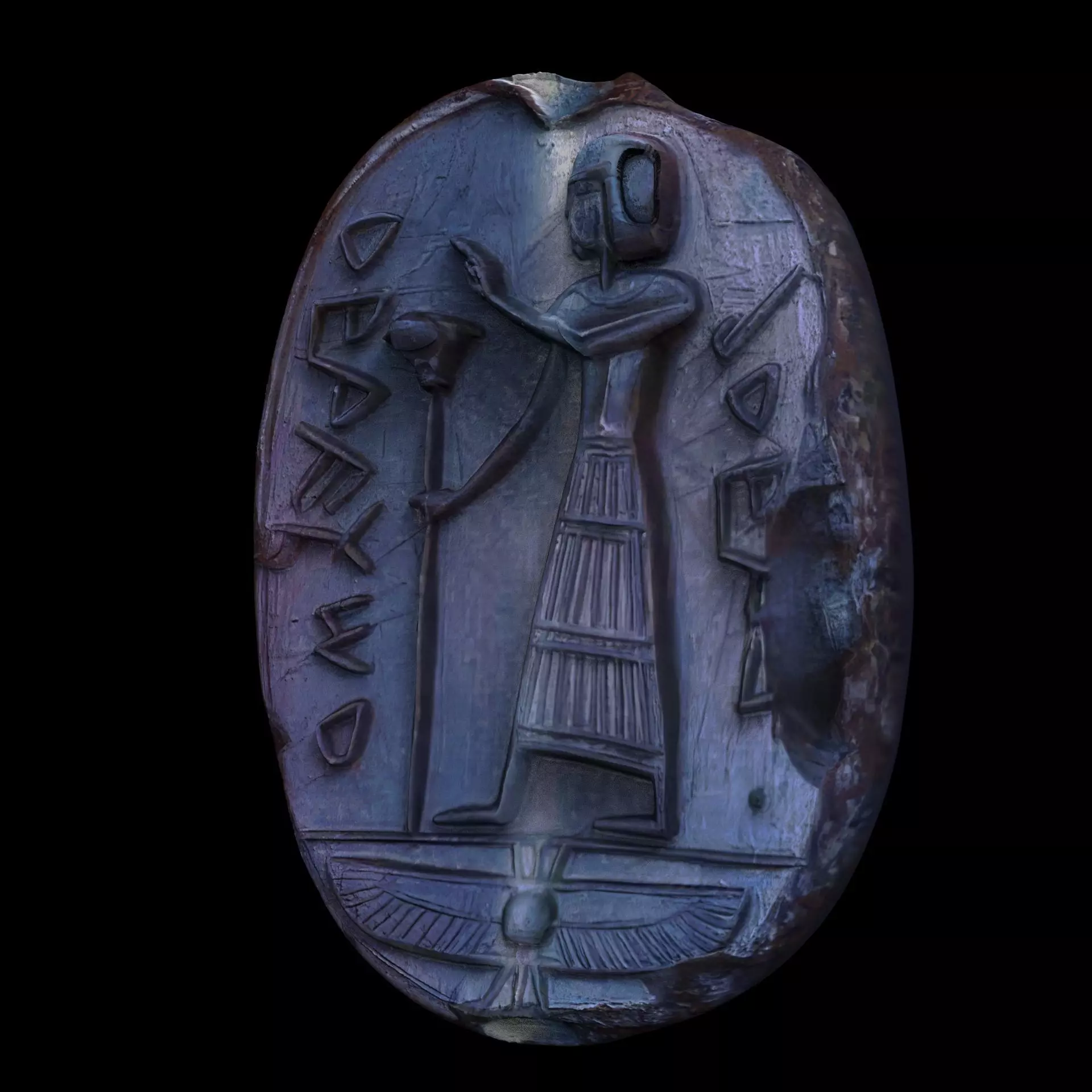 This highly accurate 3D reconstruction depicts the ancient seal and bulla of Abdi, servant of King Hoshea, the last ruler of the Israelite Kingdom of Samaria (circa 732–722 BCE). The model authentically reproduces the carnelian or chalcedony seal, featuring a robed male figure in profile, holding a papyrus scepter. Below the figure, a detailed winged sun disk motif is included, echoing the Egyptian artistic influence typical of high-status Hebrew officials.