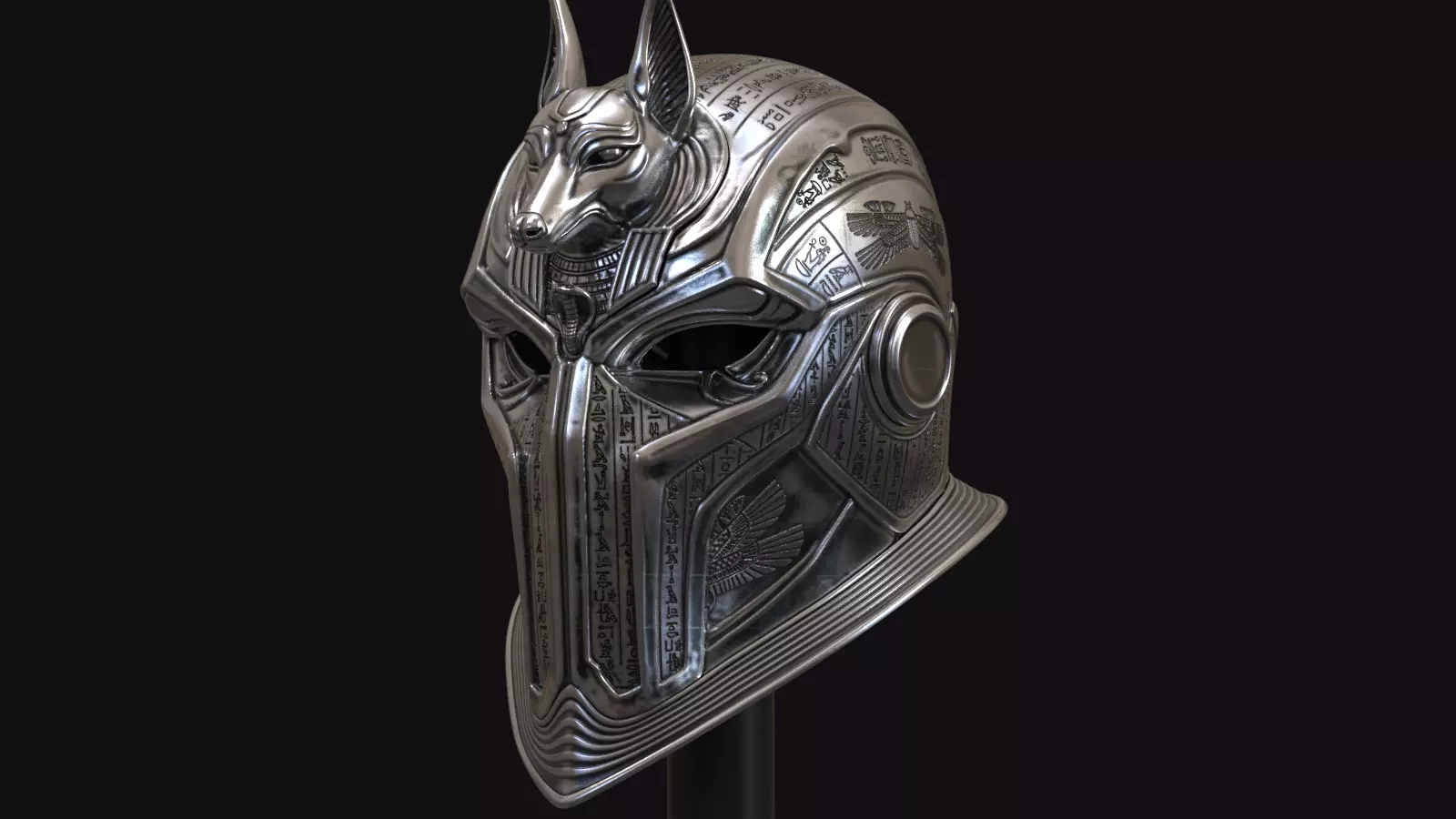 Meticulously sculpted in ZBrush, this spectacular piece fuses ancient Egyptian mythology with modern sci-fi armor aesthetics. The helmet is crowned with a striking, three-dimensional Anubis (jackal) head and features the royal cobra (uraeus). The armored panels are deeply engraved with authentic-looking hieroglyphs and sacred motifs like the winged scarab, giving it a premium, battle-ready appearance.