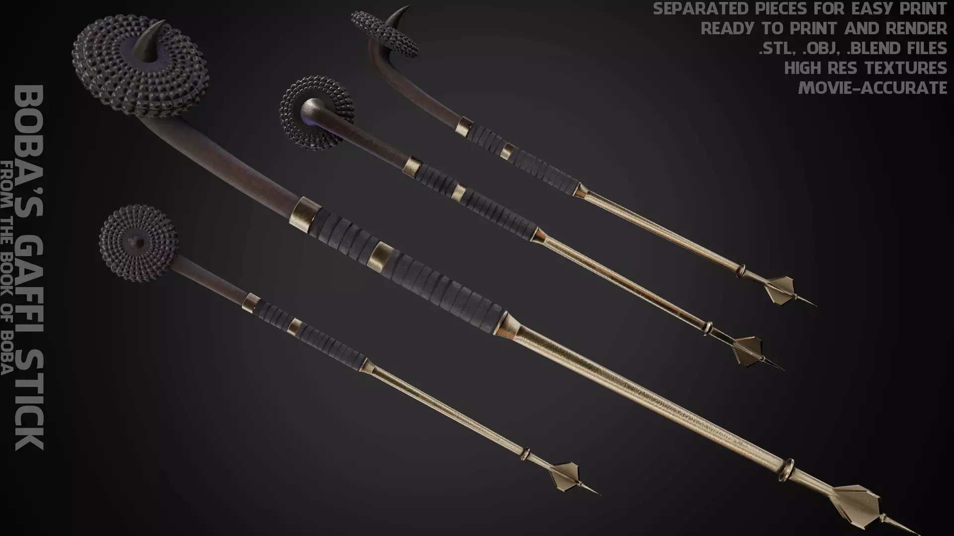 Boba Fett's Gaffi Stick from The book of Boba Fett tv-show ready to print and render (movie-accurate) real size