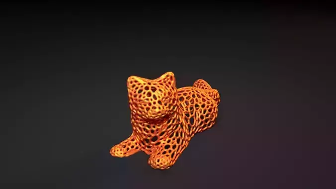 This unique 3D model is made in the modern voronoi style, which is characterized by a mesh structure with geometric fragments that create a fractal and dynamic effect. The model is a stylized cat with expressive details, ideal for printing on a 3D printer.