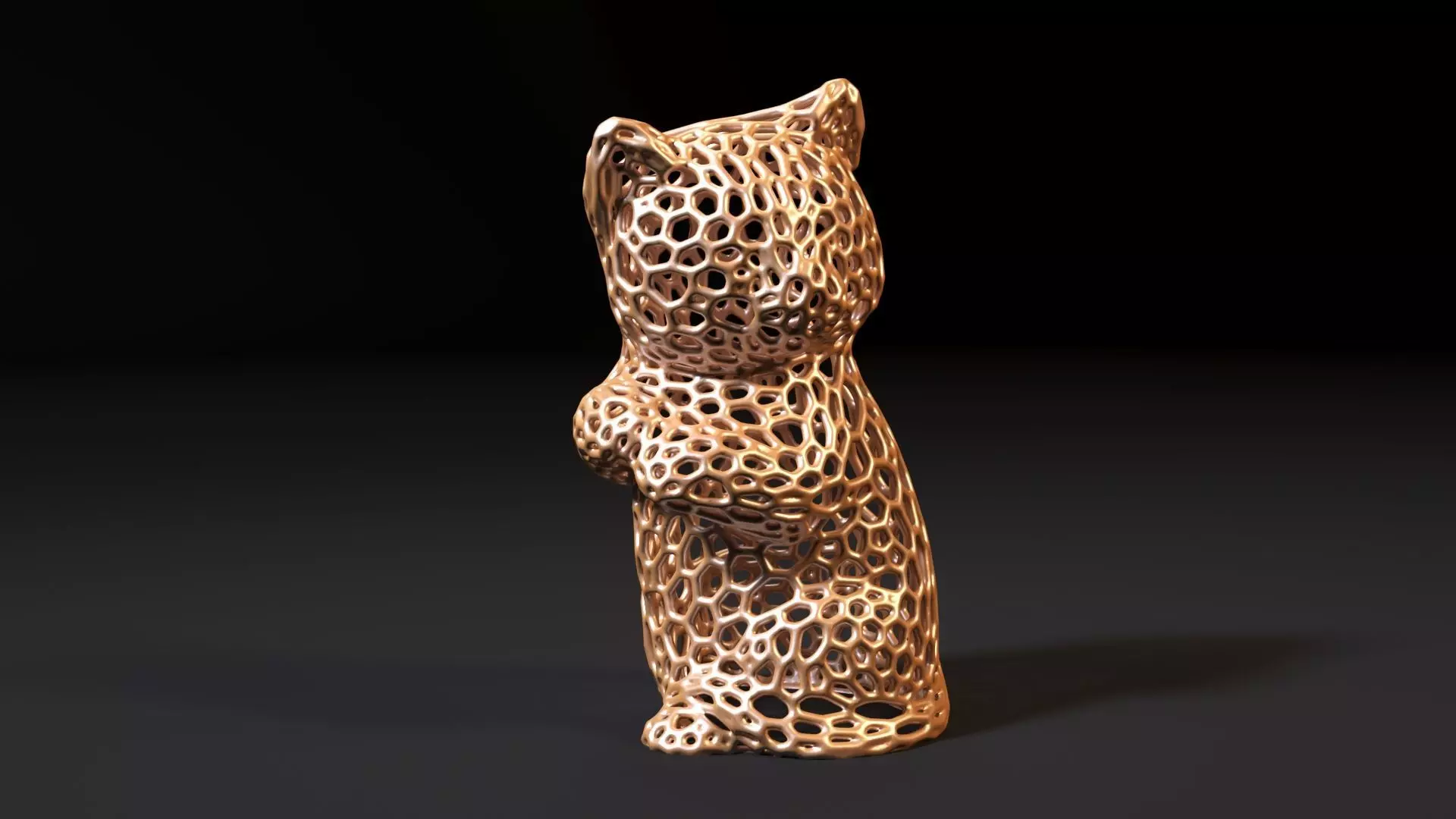 This unique 3D model is made in the modern voronoi style, which is characterized by a mesh structure with geometric fragments that create a fractal and dynamic effect. The model is a stylized cat with expressive details, ideal for printing on a 3D printer.