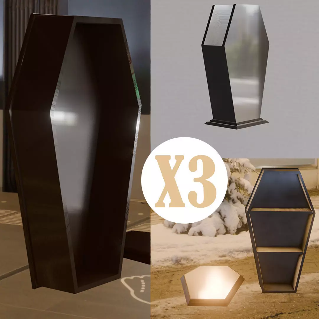 1 coffin jewelry box1 jewelry box coffin with three interior divisions.1 coffin lid compatible with both coffins1 brush holder/pen holder4 spiders in 2D4 scorpions in 2D4 bats in 2D6 skulls in 2D15 crosses in 2D (10 Christian crosses and 5 iron crosses).