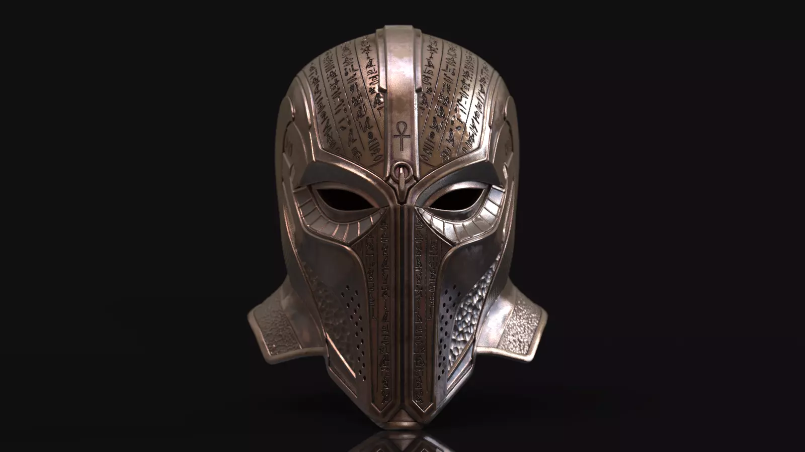 Meticulously sculpted in ZBrush, this helmet features deep, crisp hieroglyphic engravings, a prominent Ankh symbol of life on the crest, and textured side panels that give it a premium, armored aesthetic. Perfect for high-end cosplay, sci-fi prop building, or as a striking display piece for collectors.