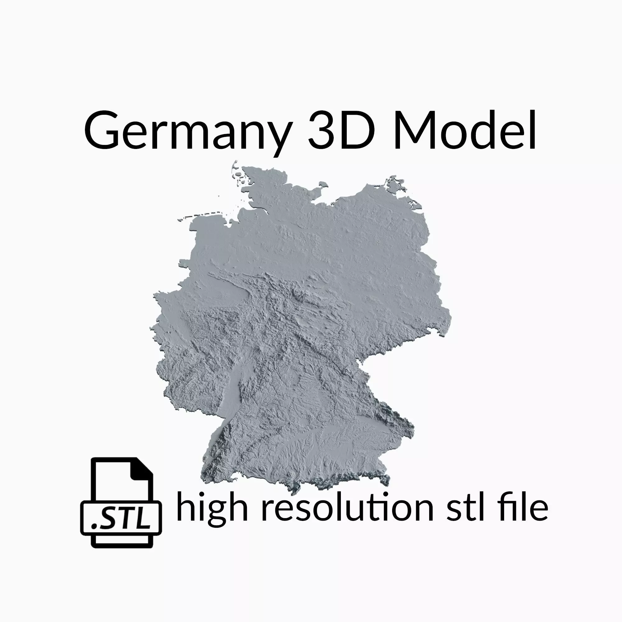 This is a topographic 3D model of the terrain of Germany. The 3D model is in STL file format and therefore compatible with CNC routers and 3D printers. The elevation of topographical features like mountains and rivers in this 3D Map has been exaggerated to better highlight the topography of Germany.
