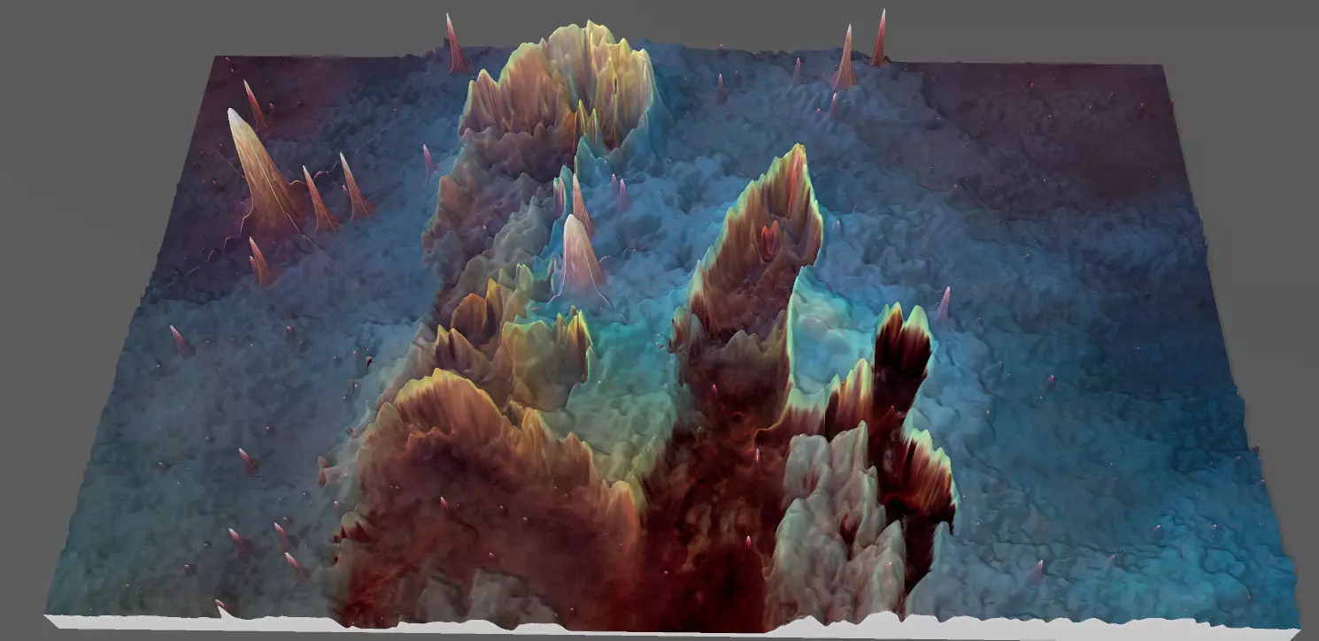 Borned star's cradle, whose light traveled thousand years for the our Spaces Telescope to record its photons!Where the material becomes denser, as a result of physical processes, it will be brighter and warmer, like as the sun! Somehow, the thickening matter creates deeper and deeper holes in space-time. Based on this, I created the negative gravity map of the image with the help of software, as gravity distorts a deep pit in space-time, the texture rises on the model, thus creating gravity mountains!