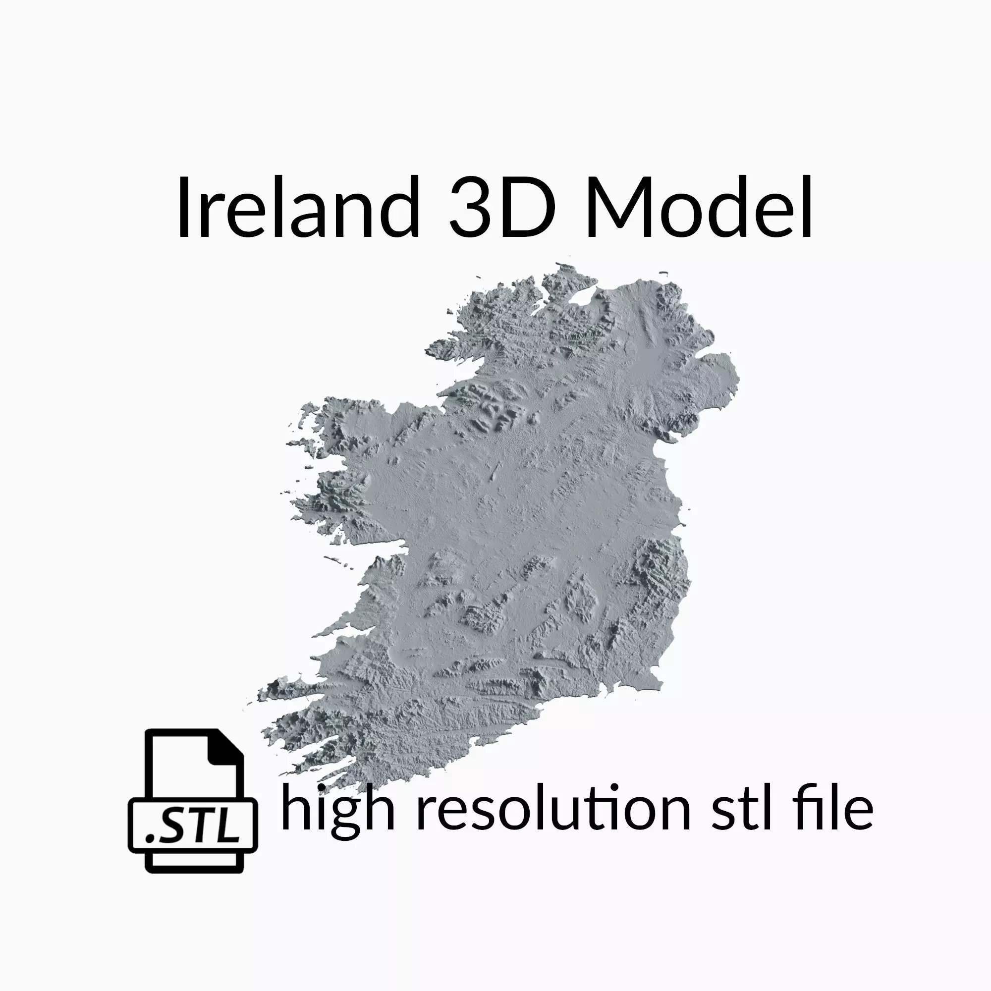 This is a topographic 3D model of the terrain of Ireland. The 3D model is in STL file format and therefore compatible with CNC routers and 3D printers. The elevation of topographical features like mountains and rivers in this 3D Map has been exaggerated to better highlight the topography of Ireland.