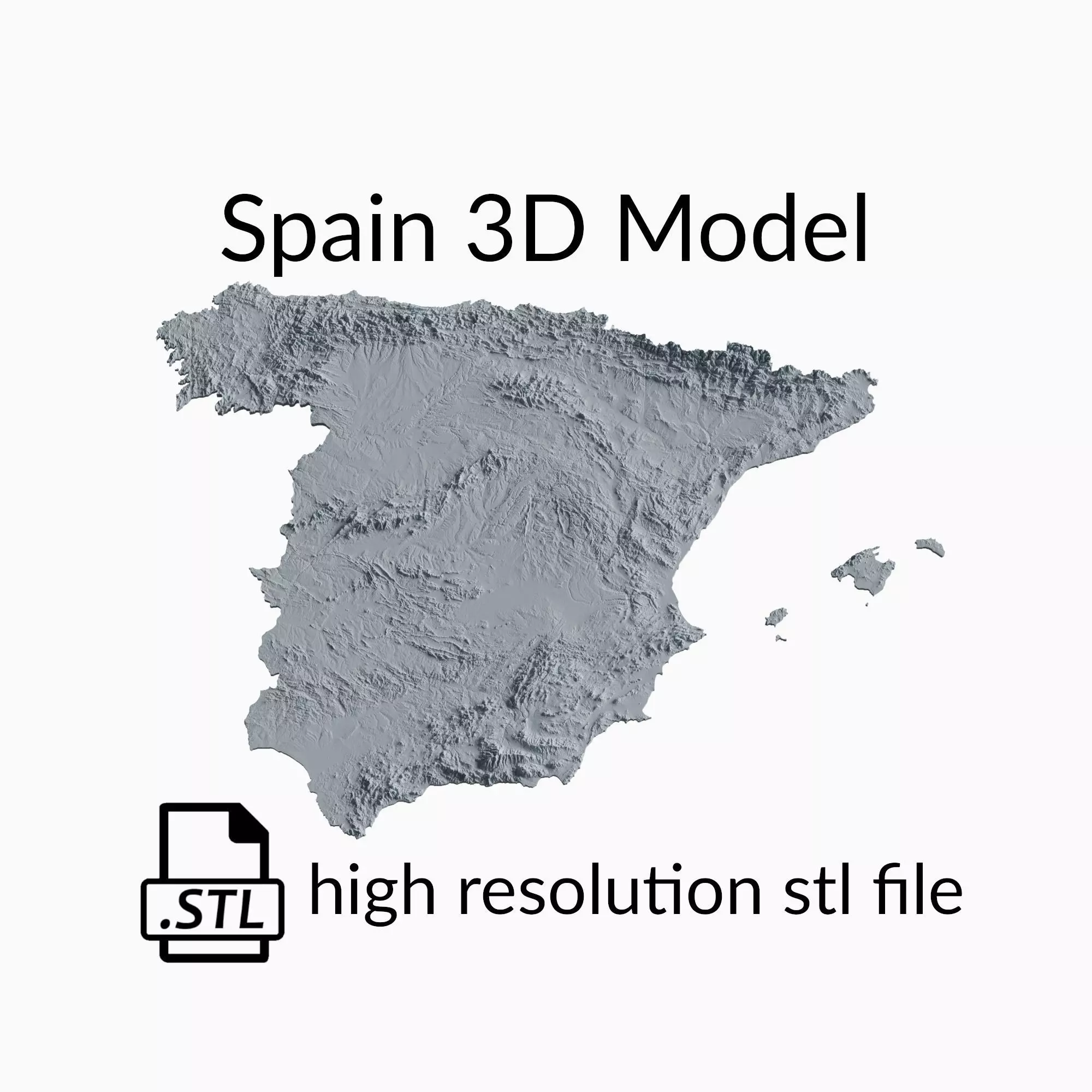 This is a topographic 3D model of the terrain of Spain. The 3D model is in STL file format and therefore compatible with CNC routers and 3D printers. The elevation of topographical features like mountains and rivers in this 3D Map has been exaggerated to better highlight the topography of Spain.