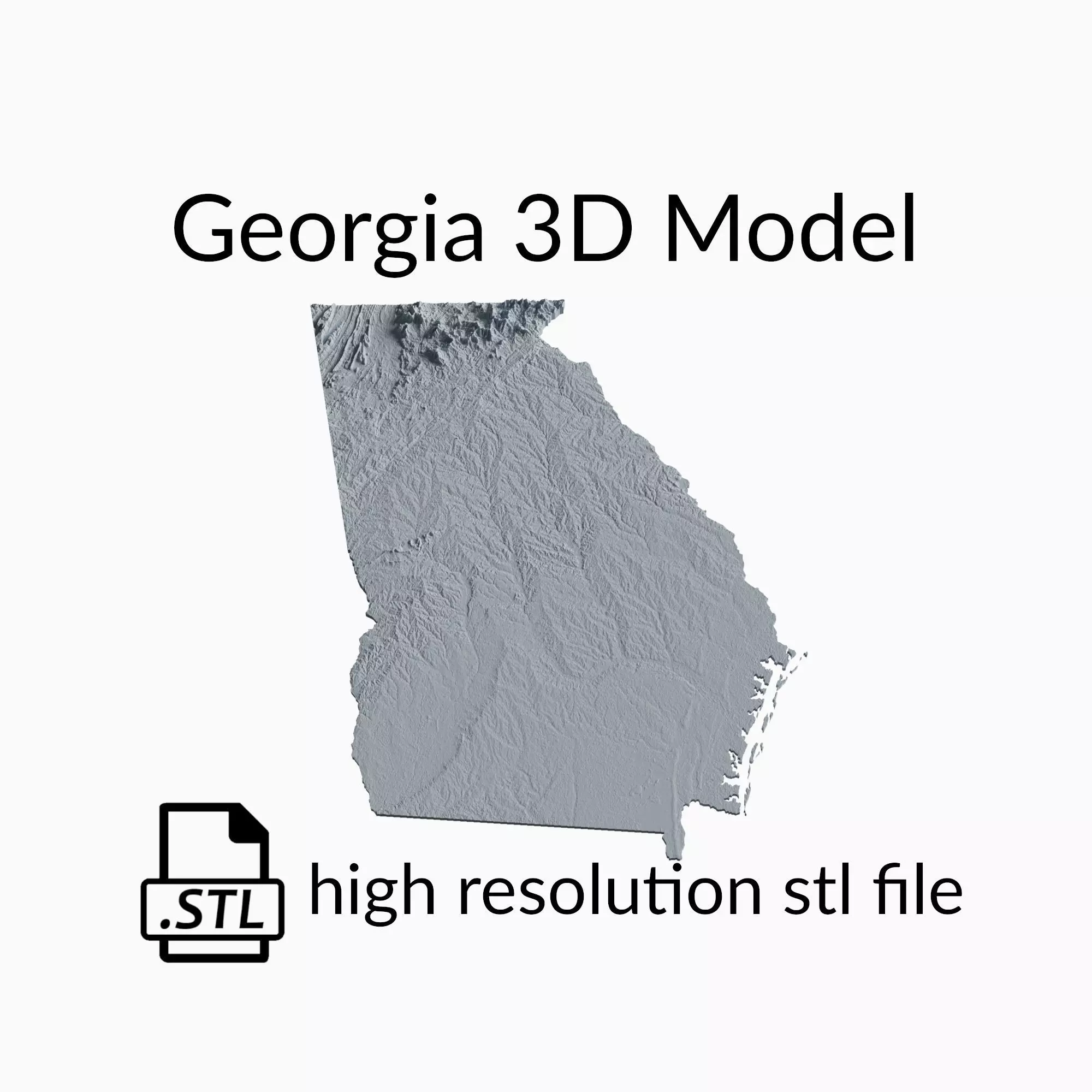 This is a topographic 3D model of the terrain of Georgia. The 3D model is in STL file format and therefore compatible with CNC routers and 3D printers. The elevation of topographical features like mountains and rivers in this 3D Map has been exaggerated to better highlight the topography of Georgia.