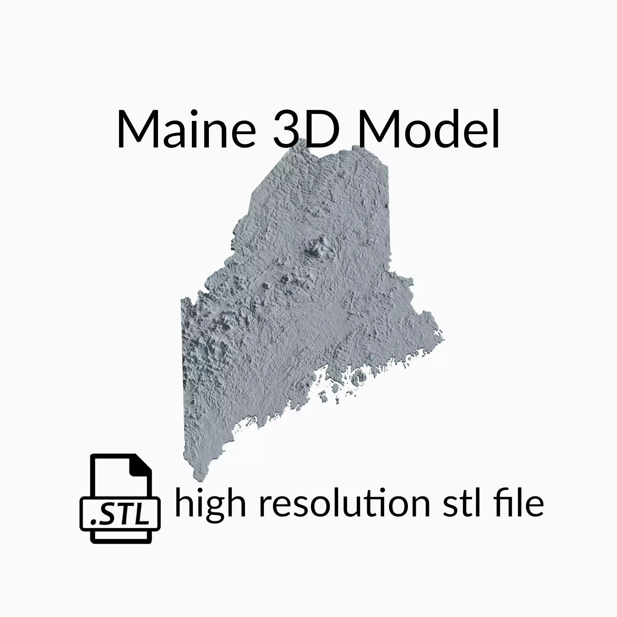 This is a topographic 3D model of the terrain of Maine. The 3D model is in STL file format and therefore compatible with CNC routers and 3D printers. The elevation of topographical features like mountains and rivers in this 3D Map has been exaggerated to better highlight the topography of Maine.