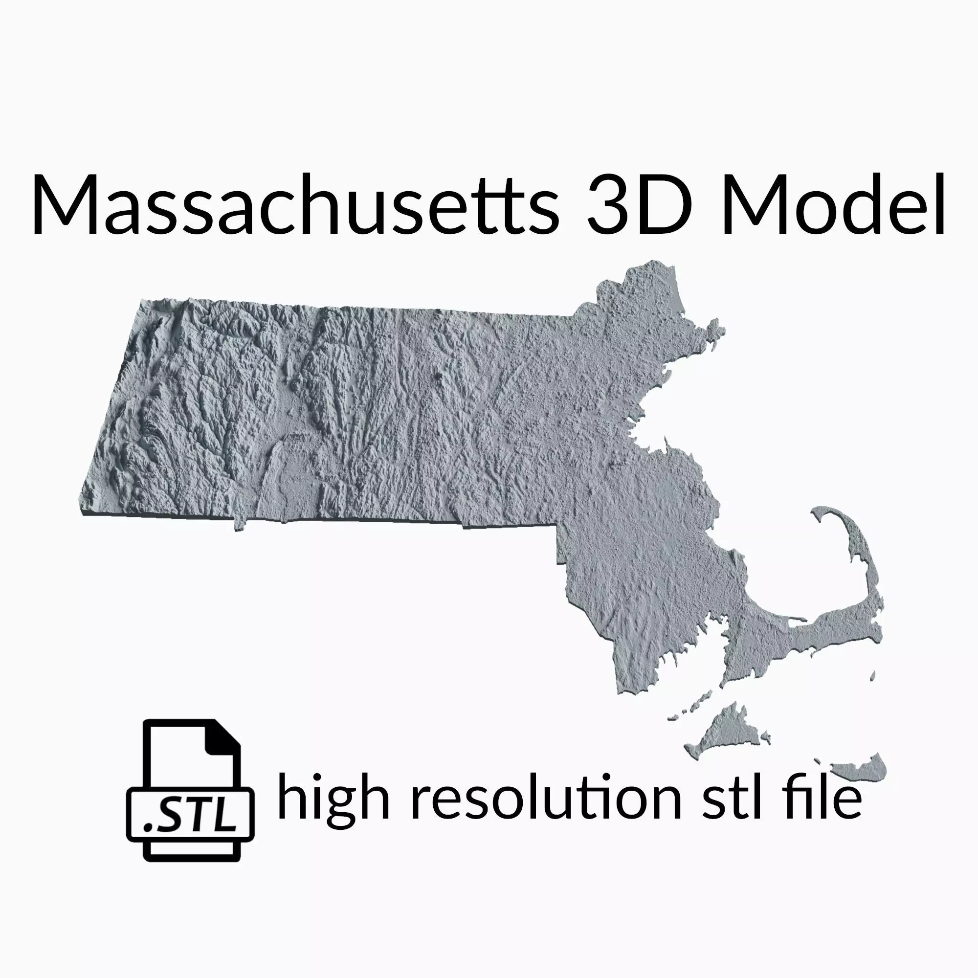 This is a topographic 3D model of the terrain of Massachusetts. The 3D model is in STL file format and therefore compatible with CNC routers and 3D printers. The elevation of topographical features like mountains and rivers in this 3D Map has been exaggerated to better highlight the topography of Massachusetts.