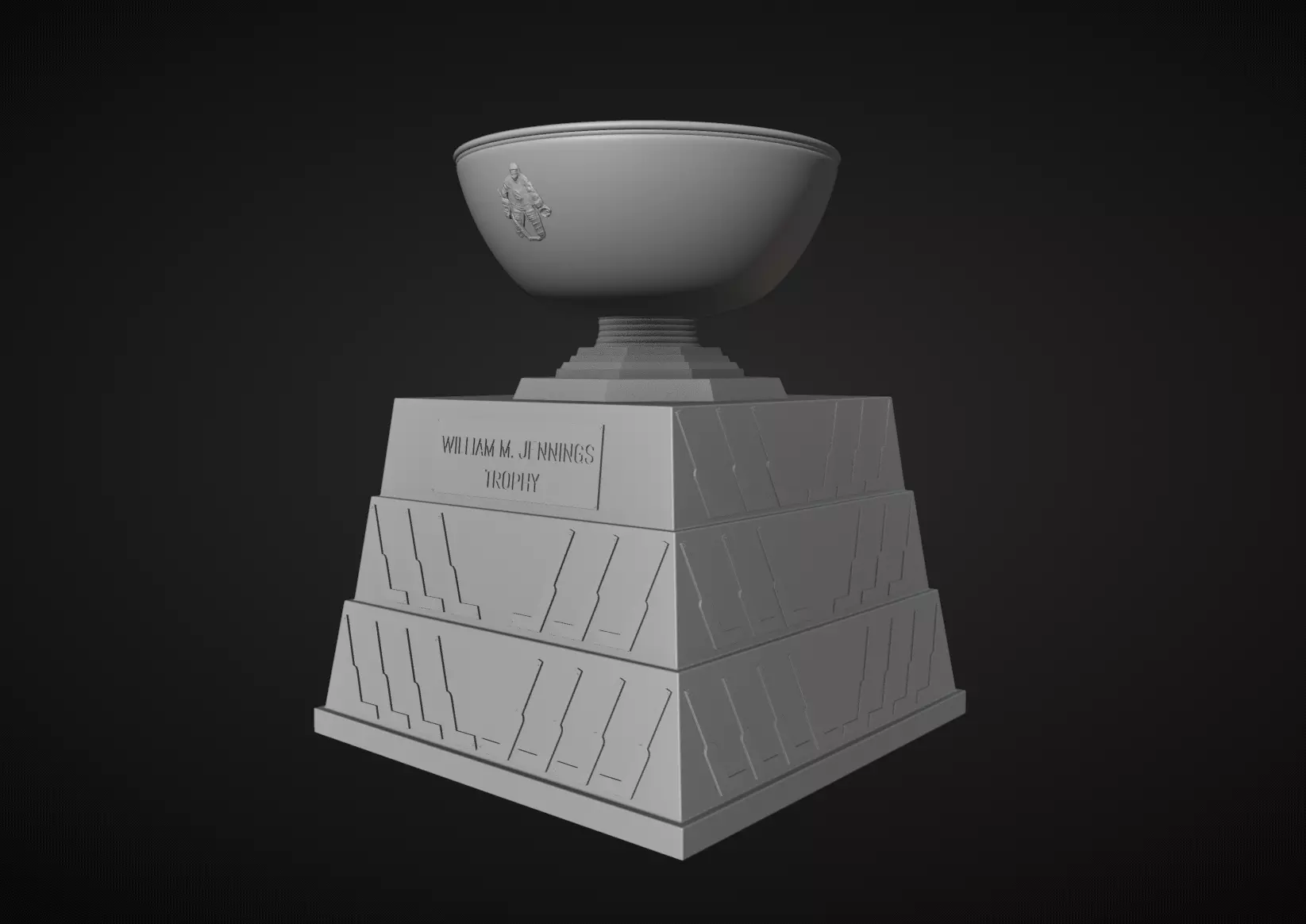 This is a 3D model of the William M. Jennings Trophy, an annual National Hockey League (NHL) award given to "the goaltender(s) having played a minimum of 25 games for the team with the fewest goals scored against it ... based on regular-season play. Optimized and ready for 3D printing. The model is split into 2 pieces for easier printing and assembly. A one-piece version is available as well.
