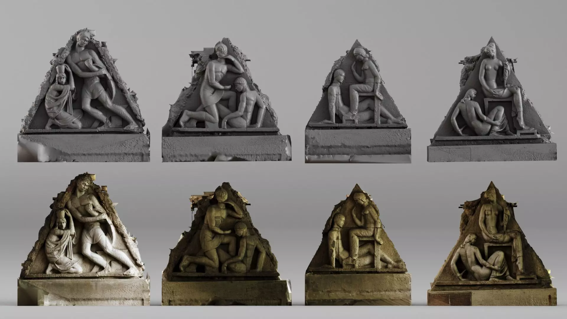 This set is provided as raw 3D scans of the original architectural reliefs and has not been optimized for direct 3D printing. The models contain natural scanning artifacts, irregular topology, and open surfaces.