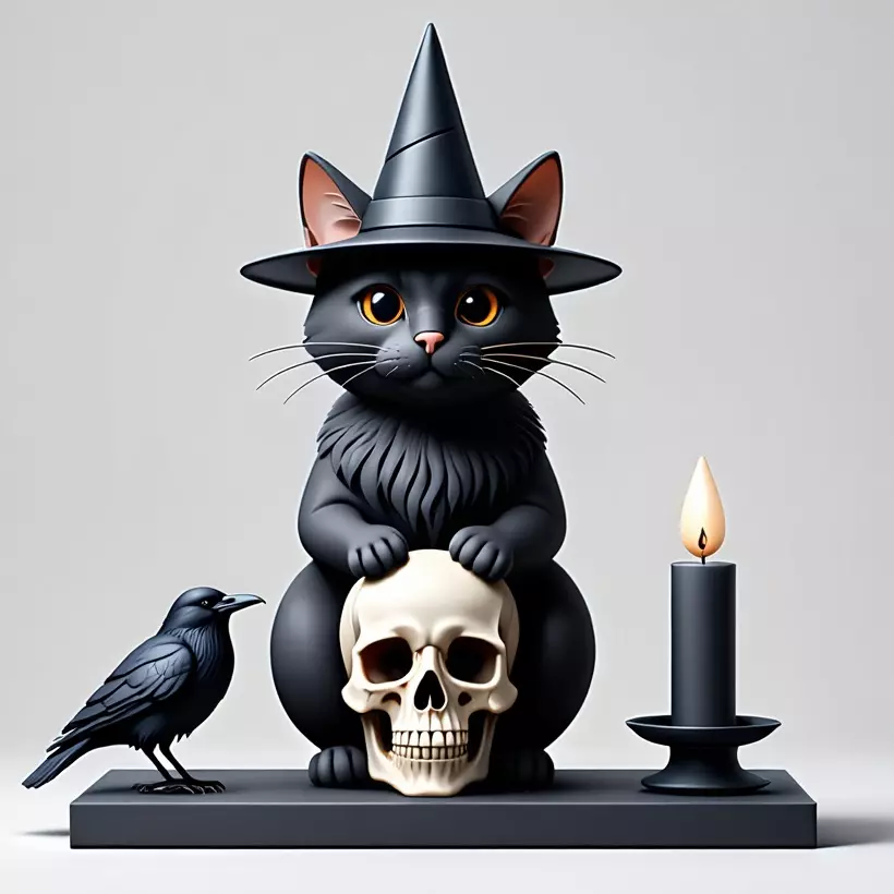 This full-figure 3D model presents a mystical composition: a cat in a pointed witch’s hat holding a human skull, accompanied by a raven and a candleholder. All elements are arranged on a shared base for structural integrity and balanced printing. Designed in a minimalist ivory style with clean lines and fine details, set against a clean background.