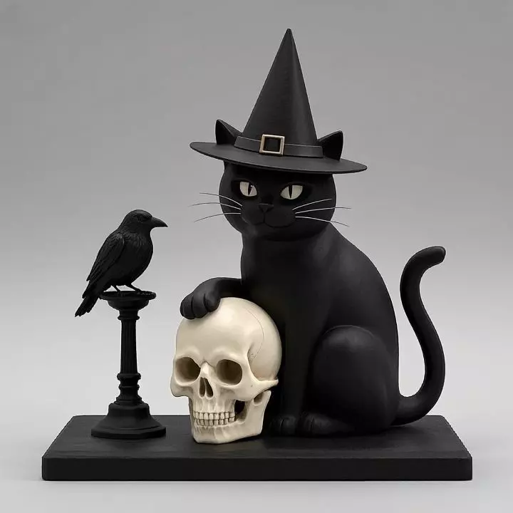 A full-figure 3D-printed statue featuring a mysterious cat in a pointed witch hat, seated on a shared base alongside a snarling human skull, a poised raven, and an elegant candlestick. Crafted in a smooth, ivory-like finish with minimalist design elements. Ideal for fantasy or gothic-themed collections.
