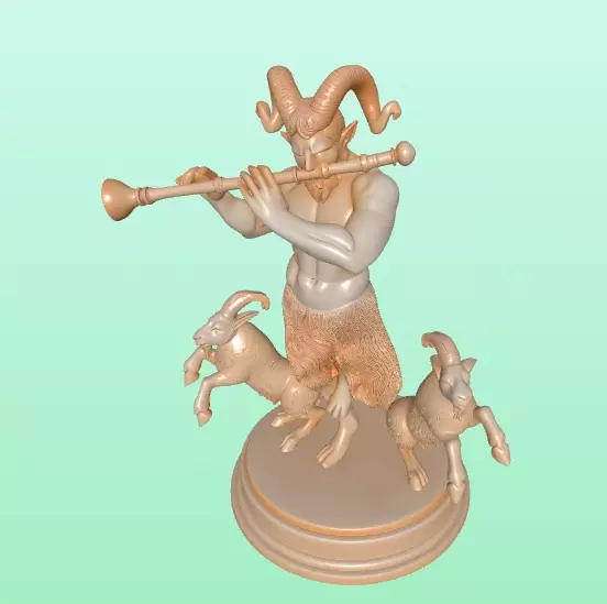 This is a full-body 3D model of a joyful faun inspired by European mythology. The faun is depicted in mid-dance, playfully prancing on his goat-like legs while playing a small flute. His posture is dynamic and expressive, conveying movement and rhythm. The figure is crafted in a smooth, minimalist style that captures the essence of the character without unnecessary detail. The model stands firmly on a simple base, ensuring stability for 3D printing. The background is clean, and the design is optimized for visual clarity and printability. The entire sculpture has the look of finely carved ivory, making it ideal for display or as a collector’s item.